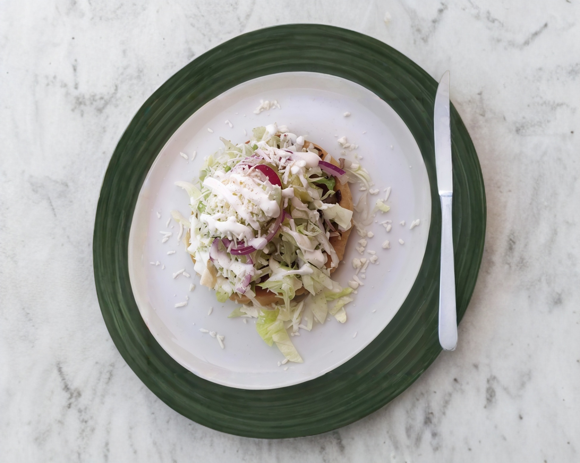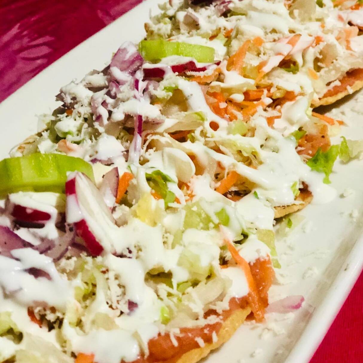 Frijol,lechuga,rábano,pepino,queso, cebolla curtida, tomatito,crema y salsa