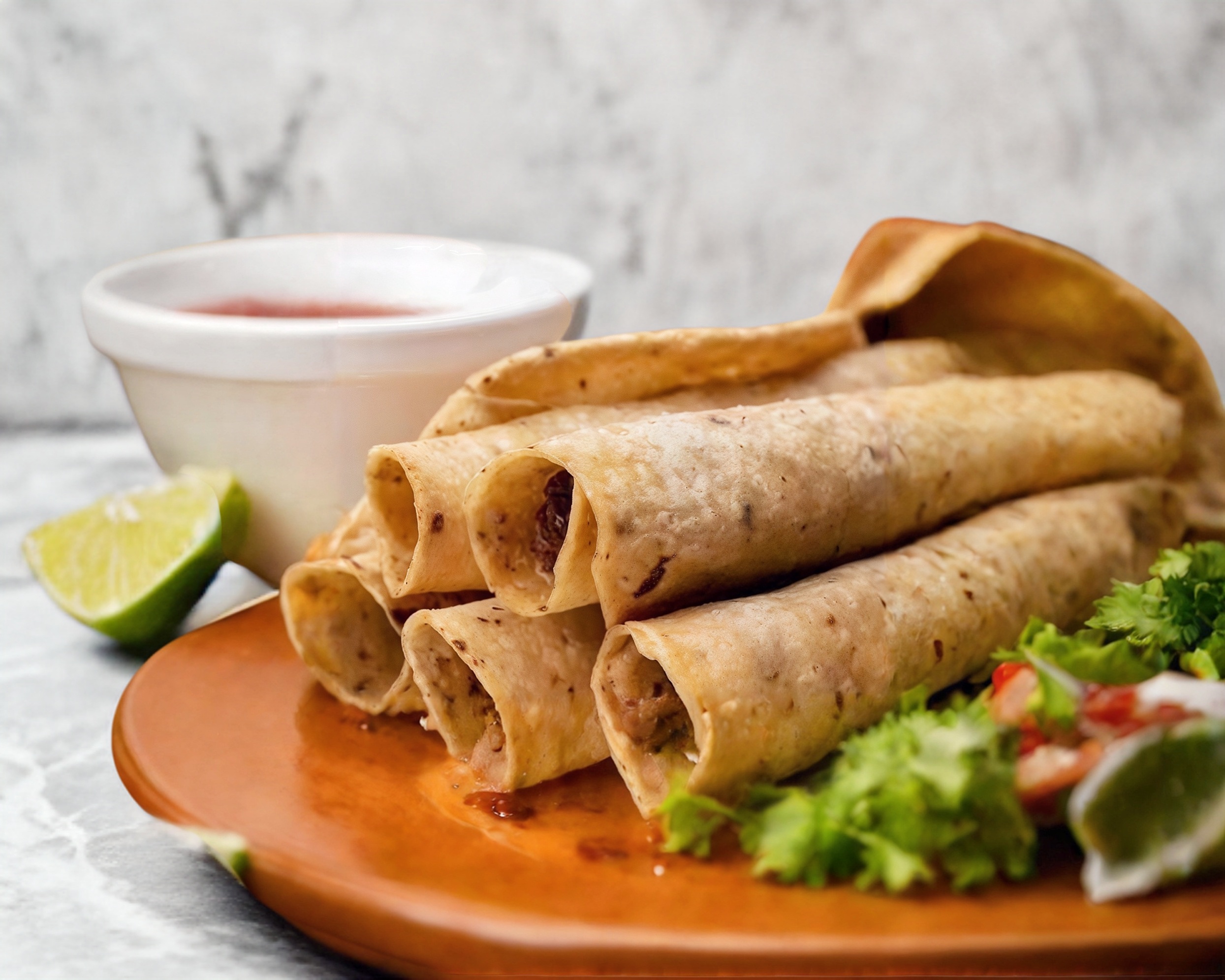 FLAUTAS ACOMPAÑADAS DE LECHUGA ,RABANO ,PEPINO,CEBOLLA CURTIDA ,CREMA ,TOMATITO YSALSA PICOSITA