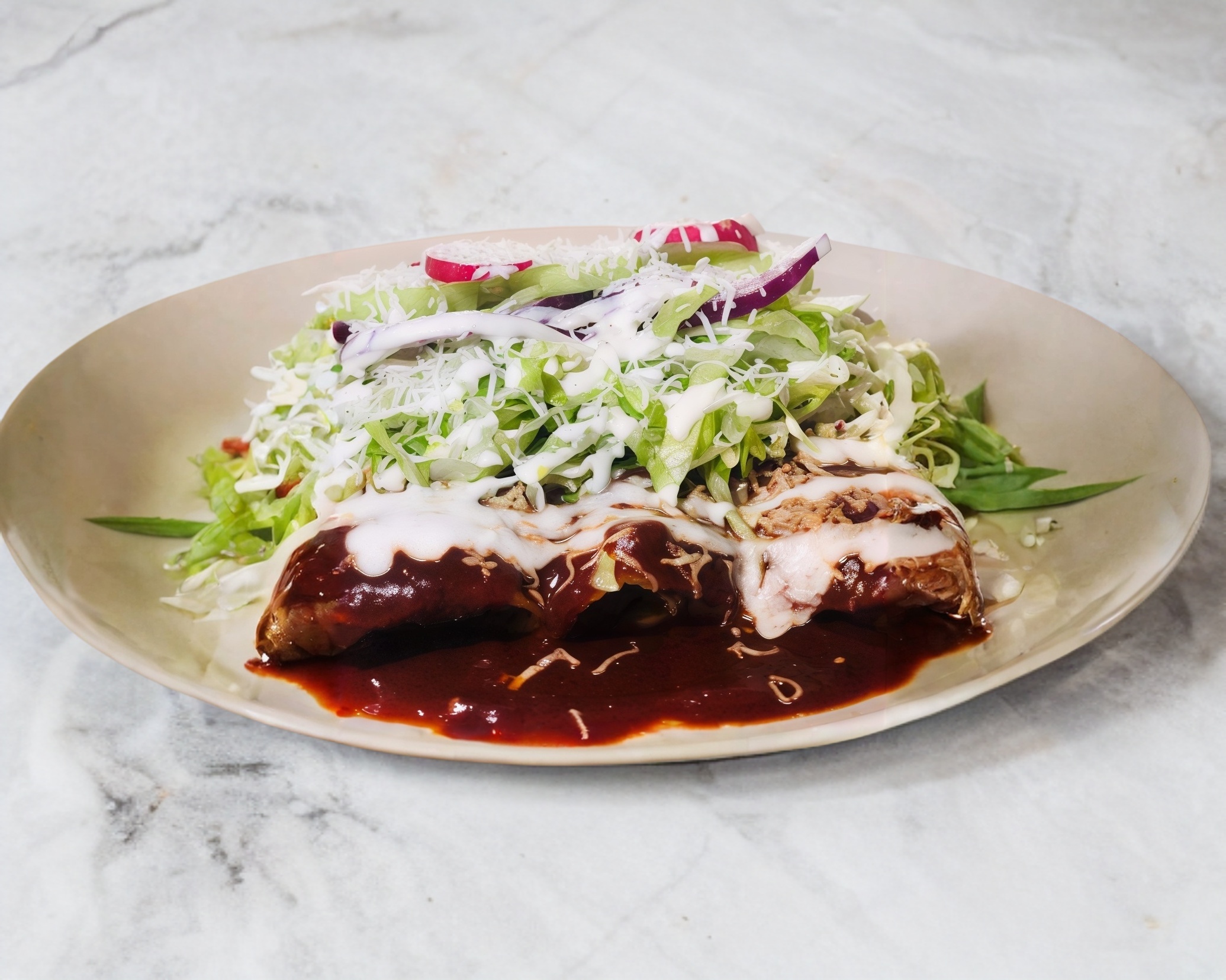 TRES TORTILLAS DE MAIZ,CON POLLO,Y BAÑAS DE MOLE TRADICIONAL,Y ACOMPAÑAS DE LECHUGA CEBOLLA CURTIDA,RABANO,PEPINO Y QUESO ESPOLVOREADO Y CREMA