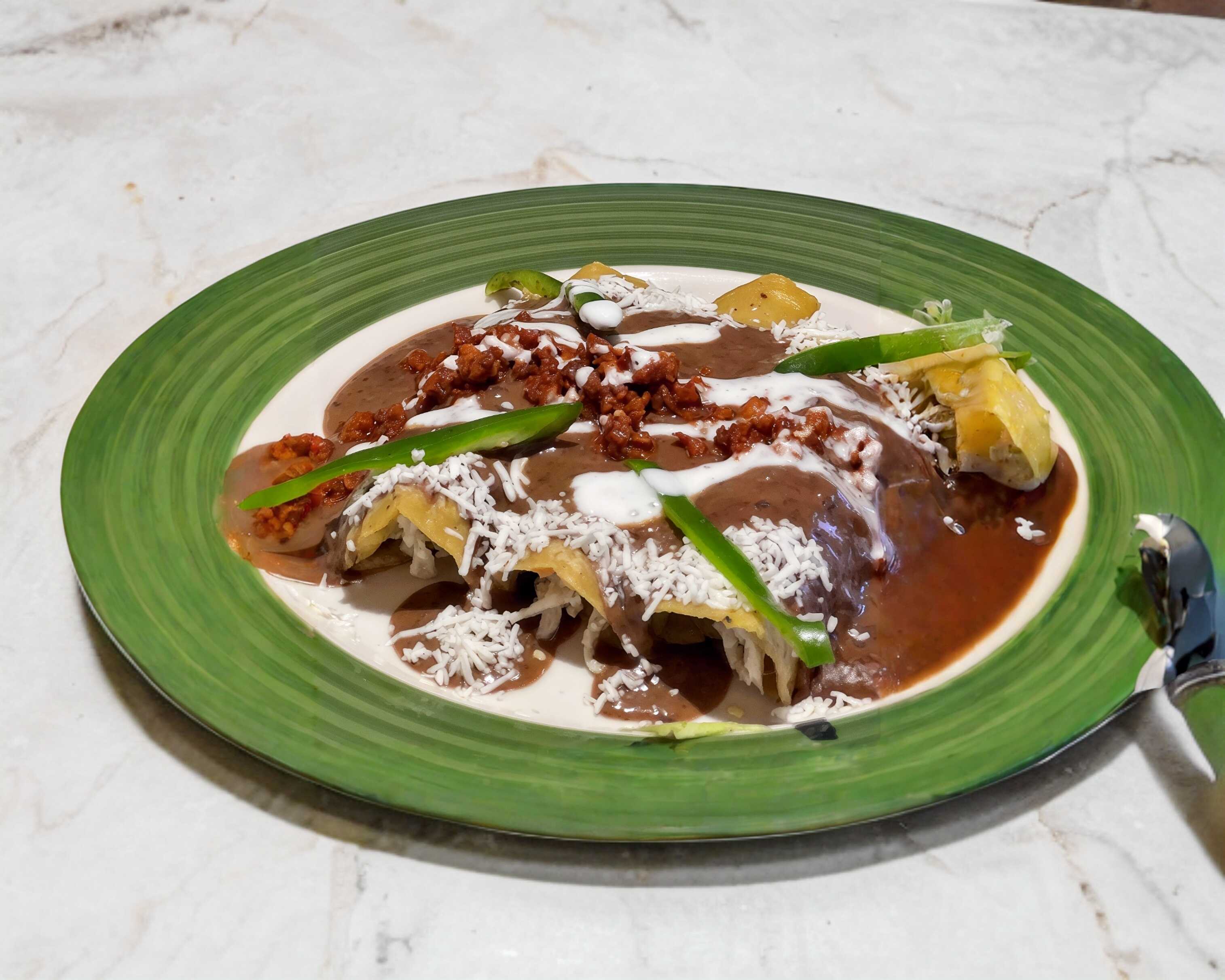 TRES TORTILLAS SOFREIDAS, ENVUELTAS DE FRIJOS Y POLLO COCIDO ,BAÑAS EN SALSA DE TOMATE Y ESPECIAS .ACOMPAÑADAS DE LECHUGA RABANO,PEPINO, CEBOLLA CURTIDA Y CREMA AUN LADO,,,