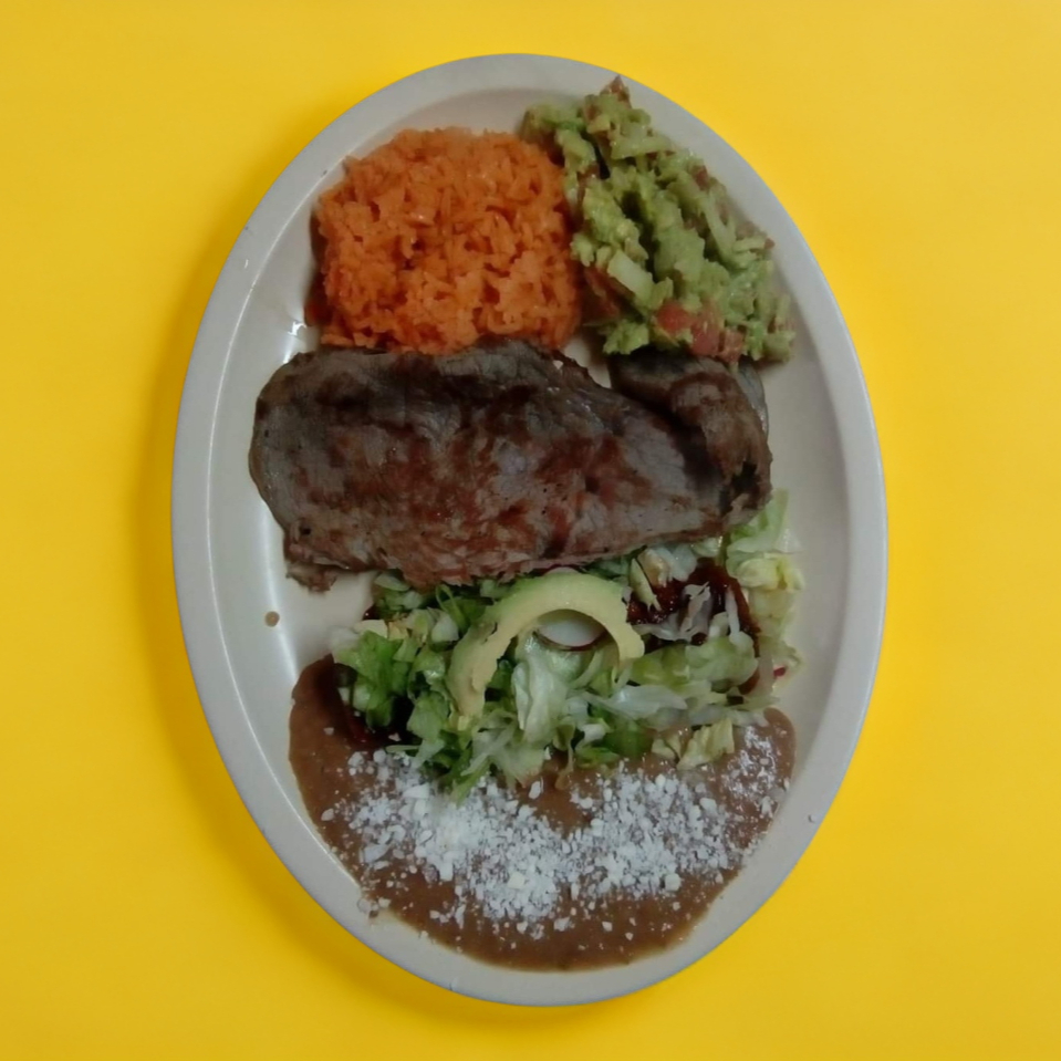Carne asada, frijol, arroz, 1 enchilada y guacamole