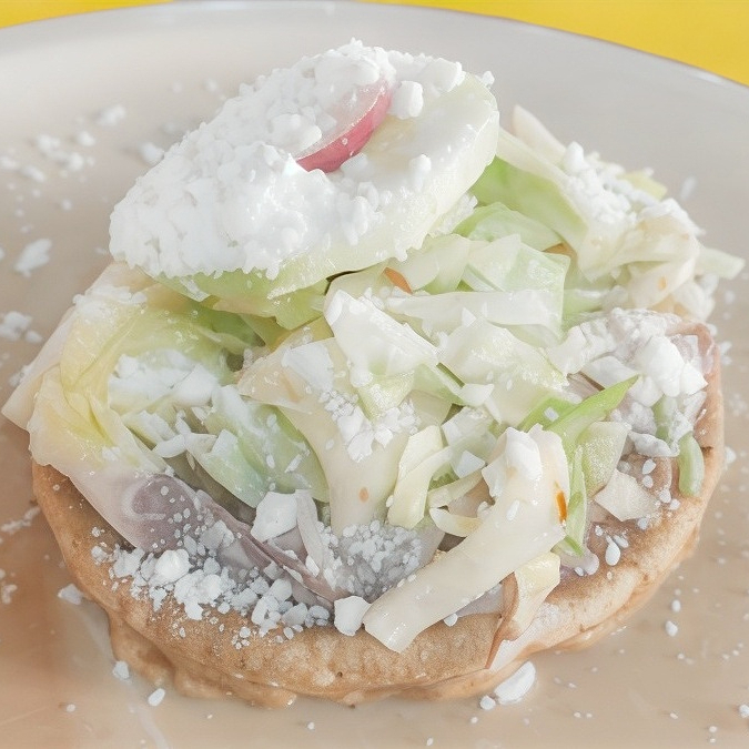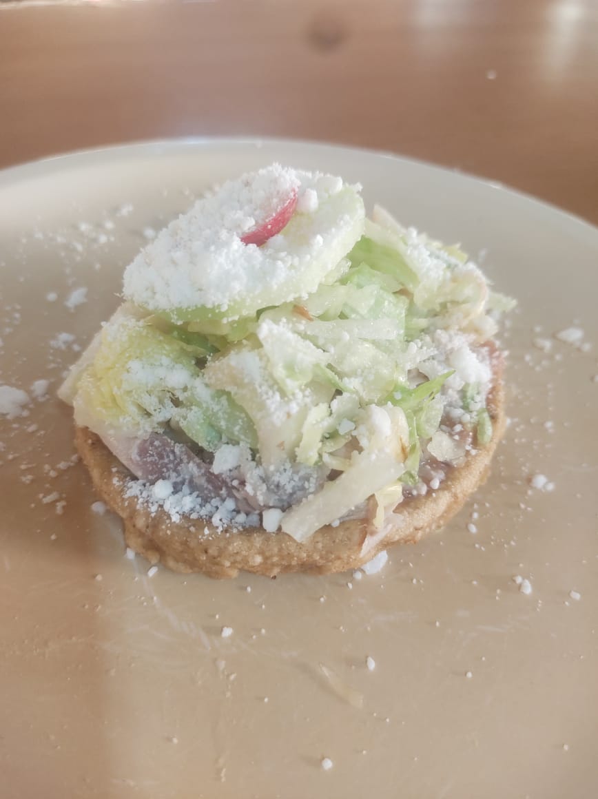 Sope con frijol, carne y queso gratinado