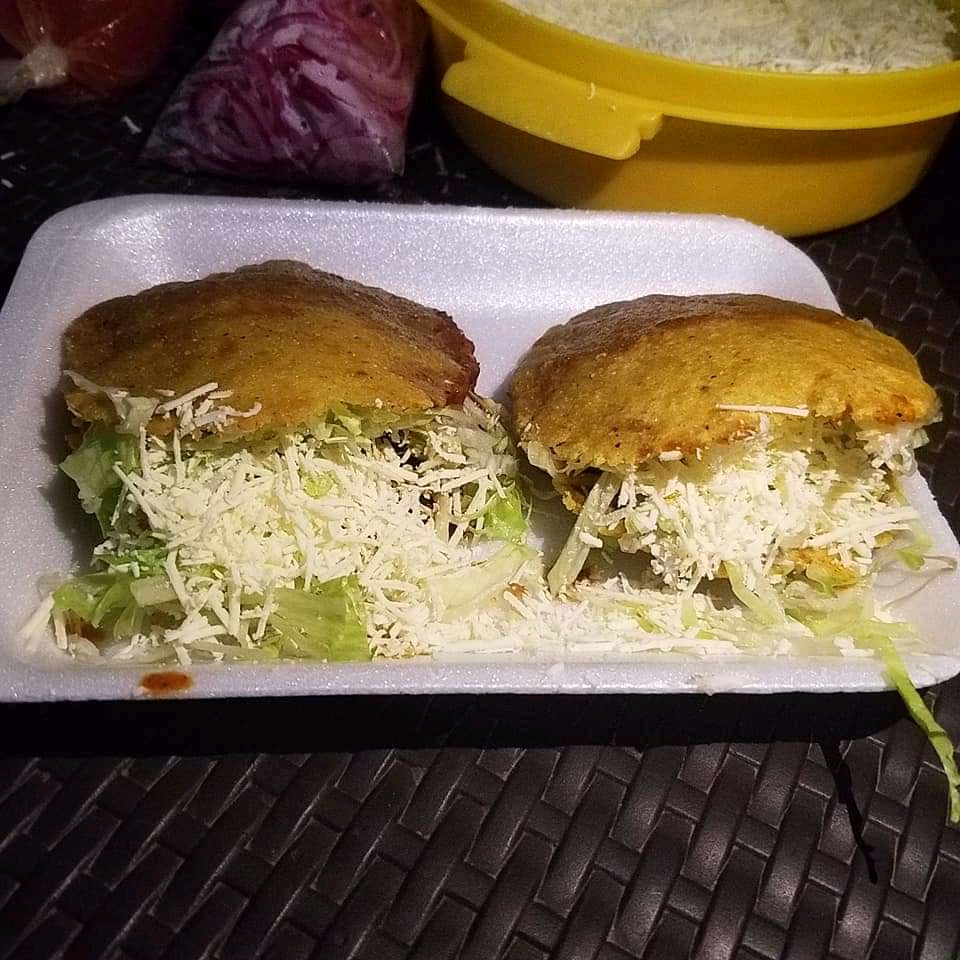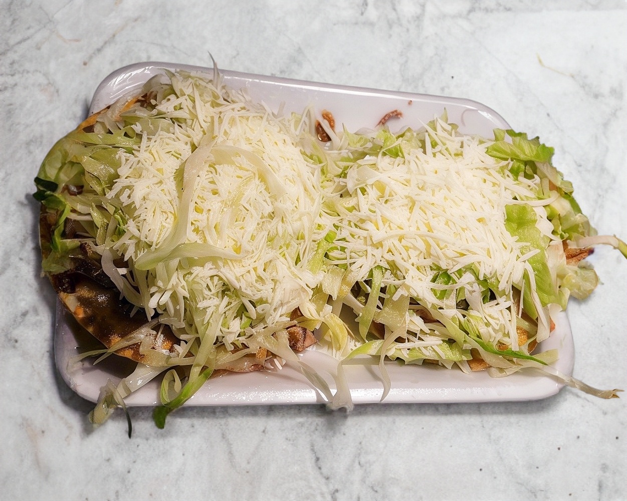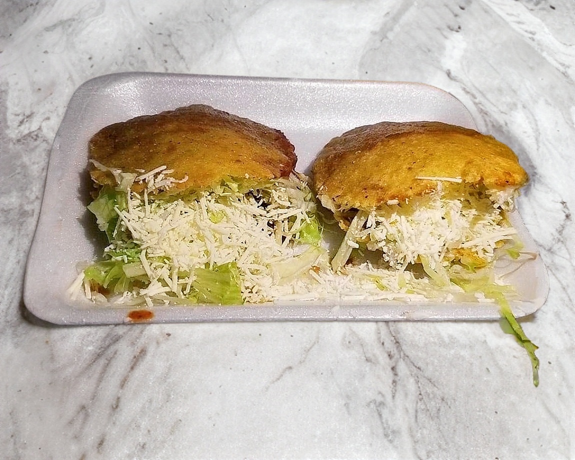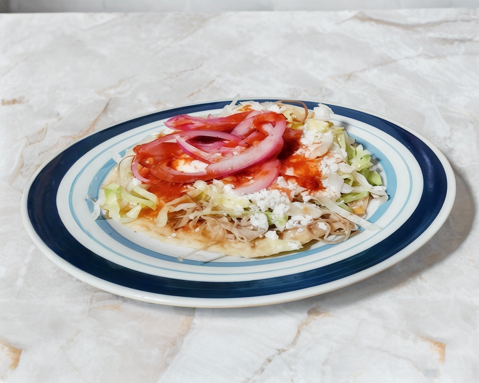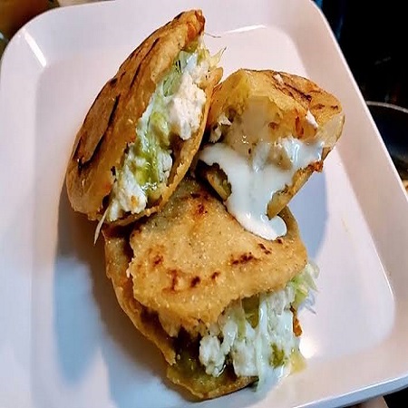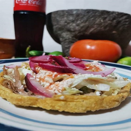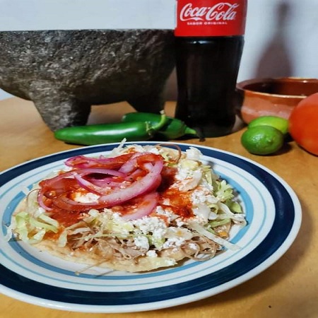 Masa de maiz frita con una base de frijol, carne de res, lechuga fresca y queso cotija.