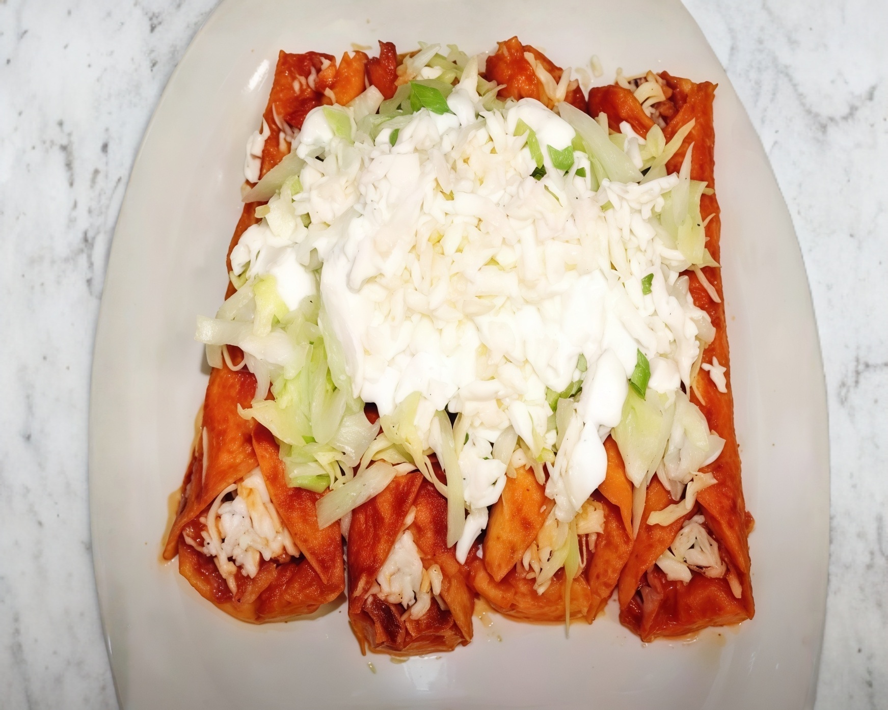 6 Enchiladas de pollo bañadas con salsa roja y acompañadas de lechuga fresca y queso cotija.