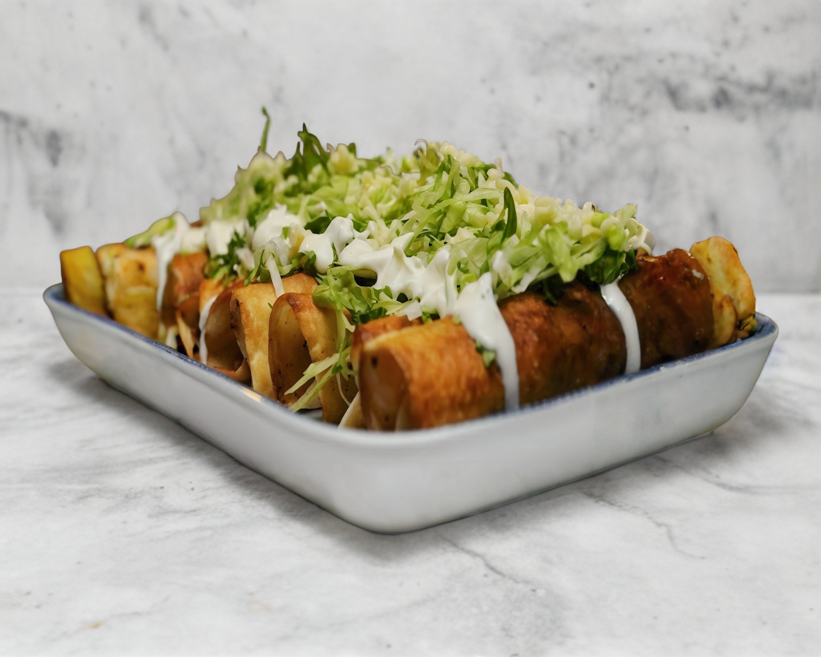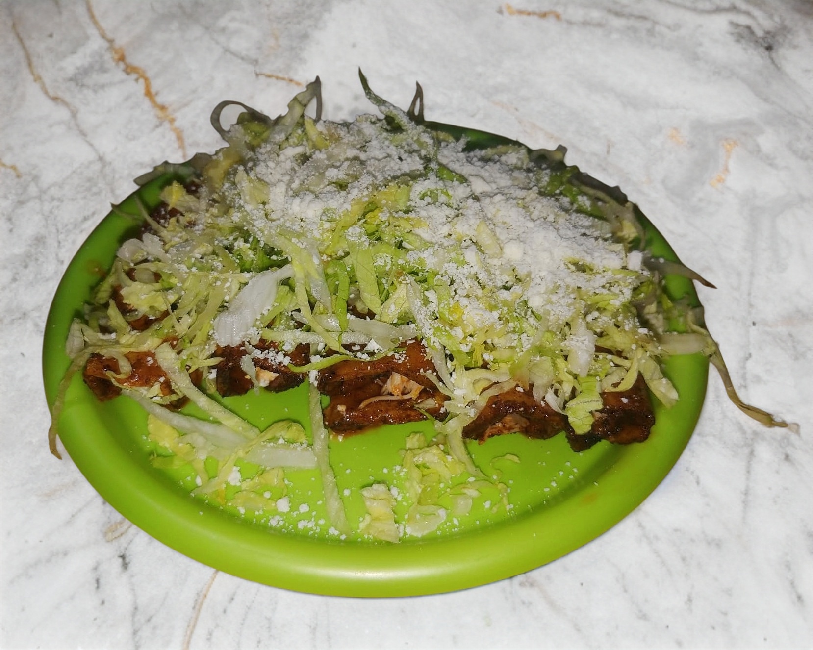 12 piezas elaborado Tortilla de maíz con pollo y su respectivo acompañamiento, queso, lechuga y aguacate.