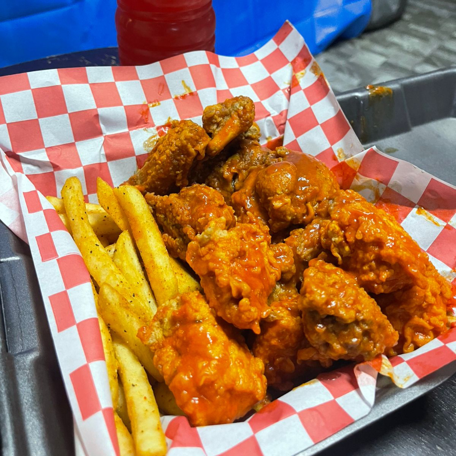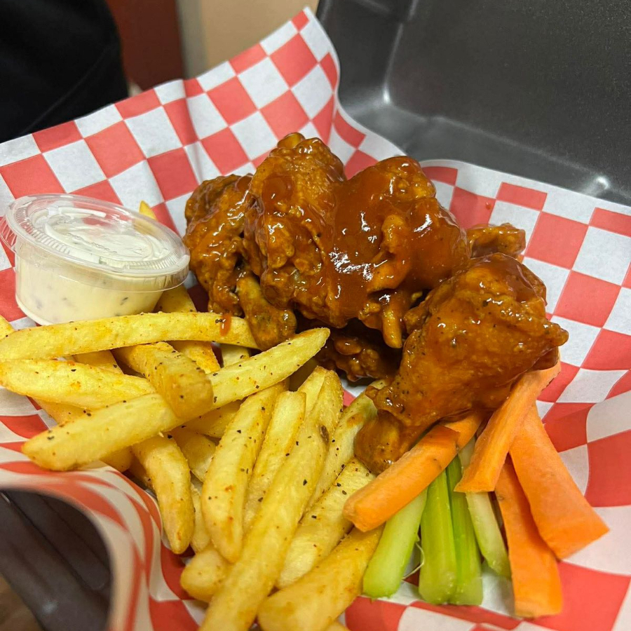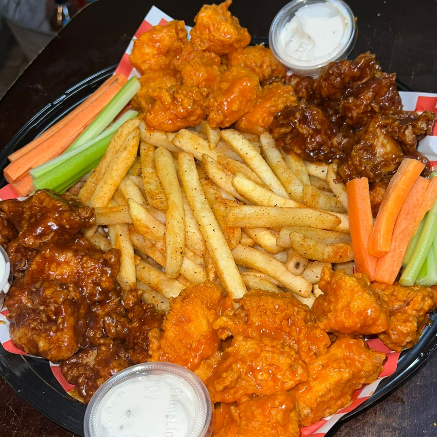 250 gramos de boneless, 300 gramos de alitas y papas acompañados de zanahoria, apio y ranch