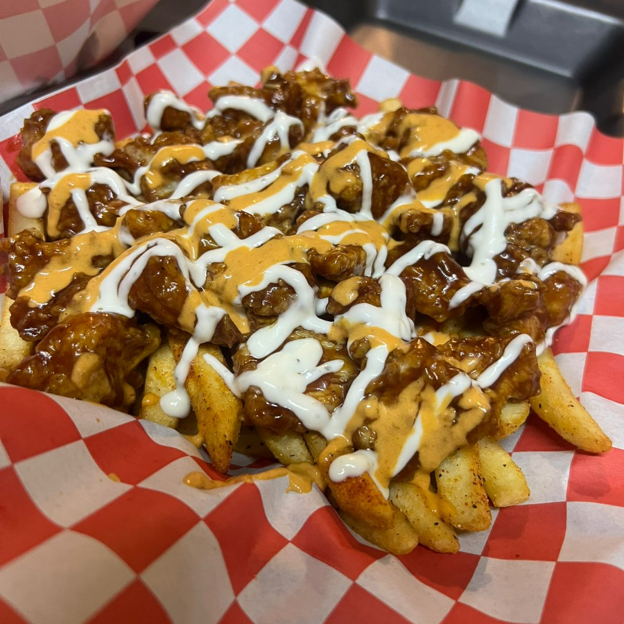 Cama de papas con boneless bite, bañados con ranch y chipotle.
