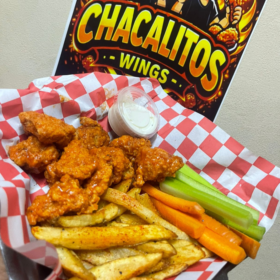 1 Kilo de alitas, acompañadas de papas, zanahoria, apio y ranch