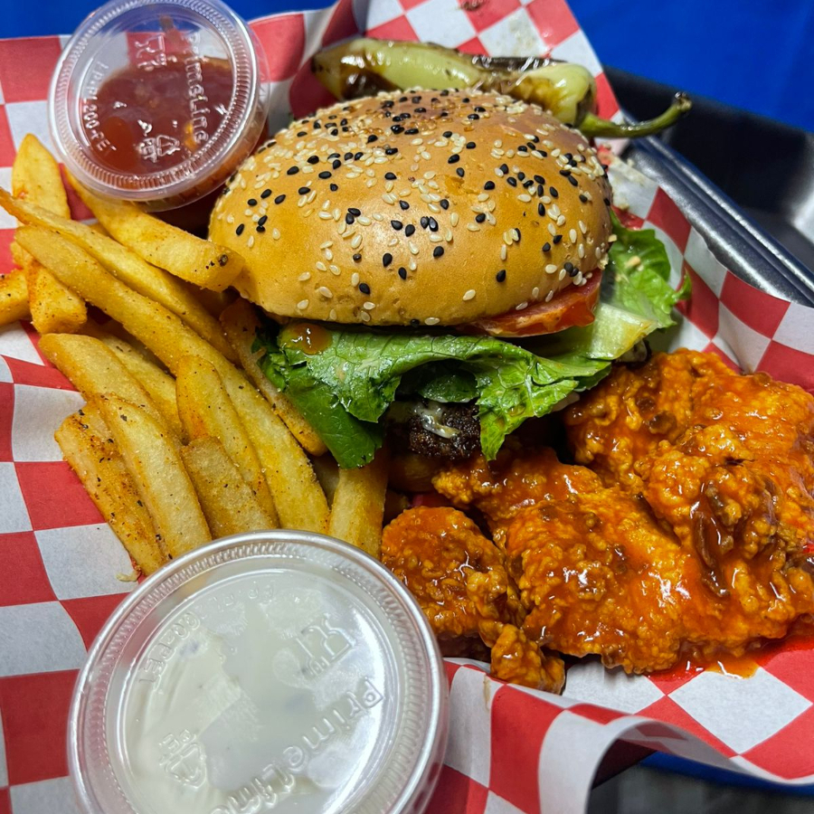 Hamburguesa de res con porcion de boneless, papas y aderezos