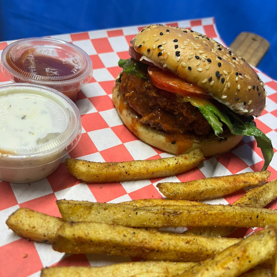 Hamburguesa de pollo con salsa buffalo, papas y aderezos
