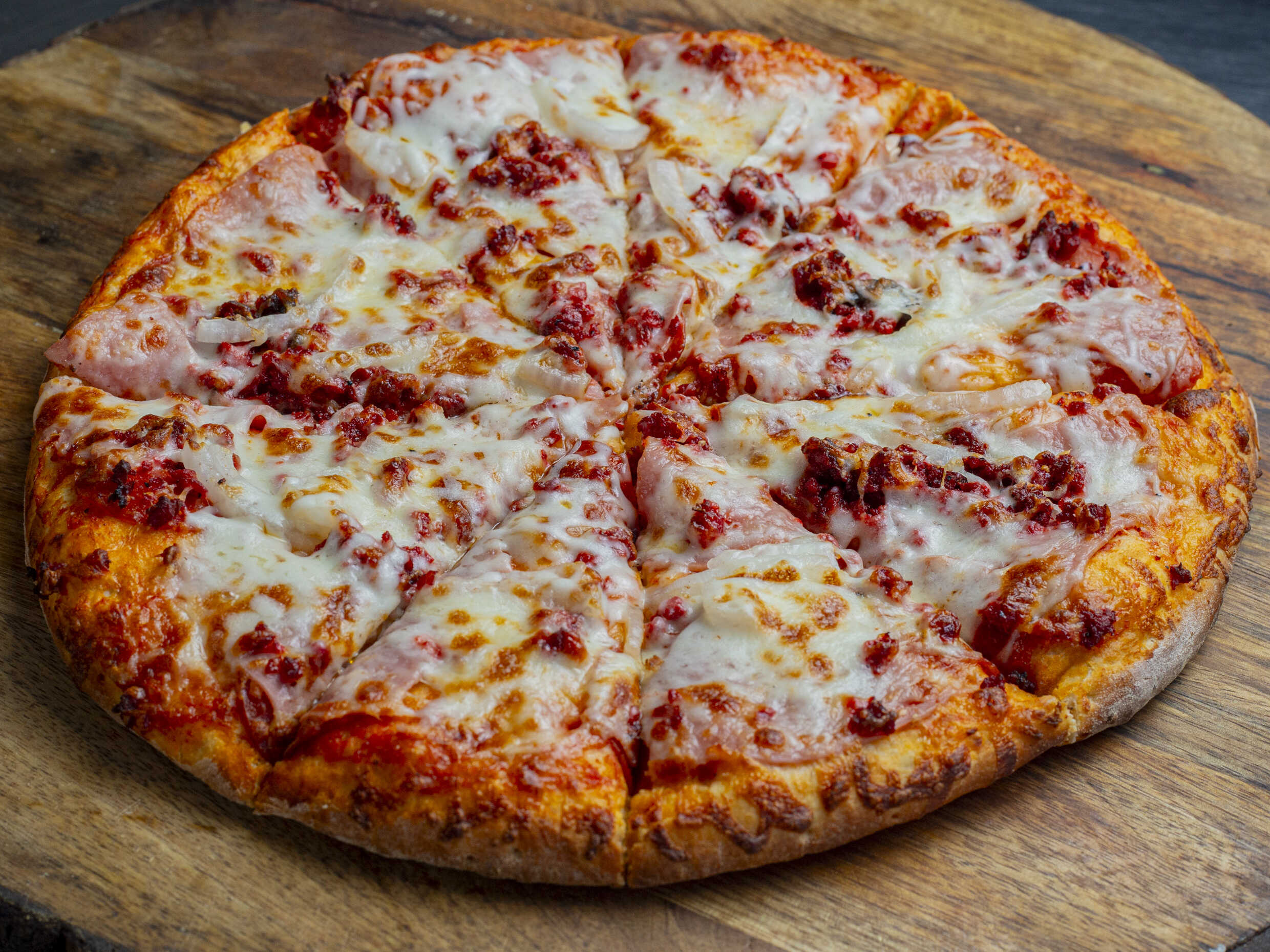 Salsa, queso, pepperoni, jamón, cebolla y chorizo.