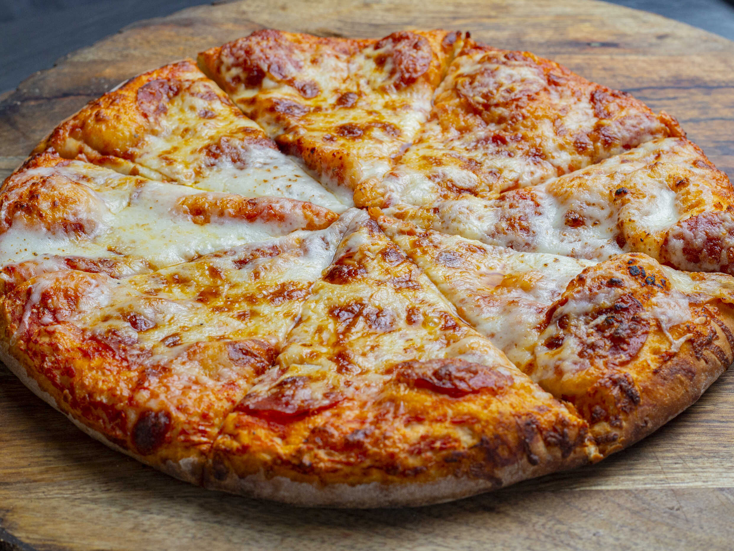 Pizza Pepperoni Grande (12 rebanadas): preparada con salsa, queso y pepperoni. Elige extras si deseas.