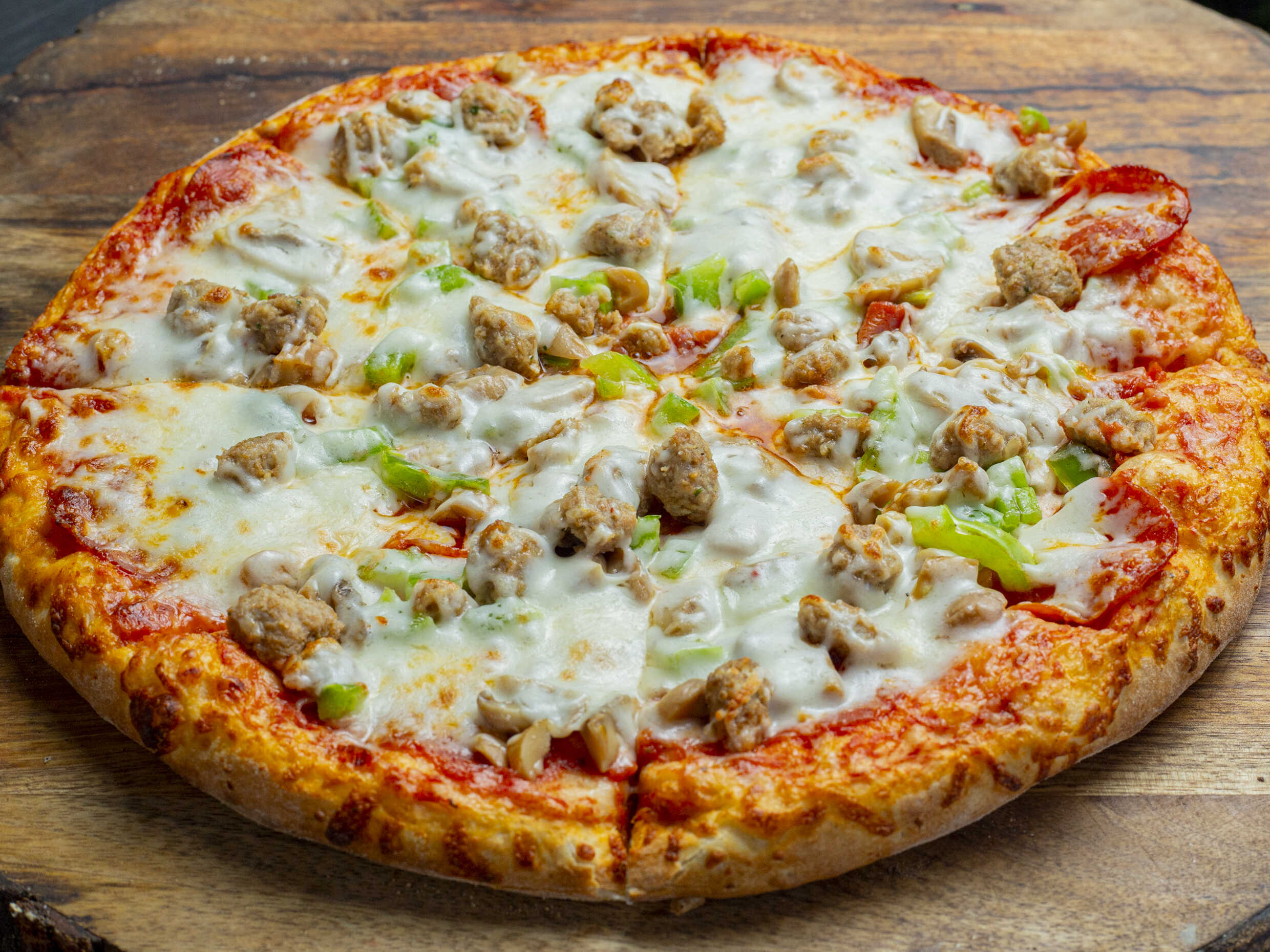 Salsa, queso, pepperoni, champiñón, salchicha italiana y morrón.