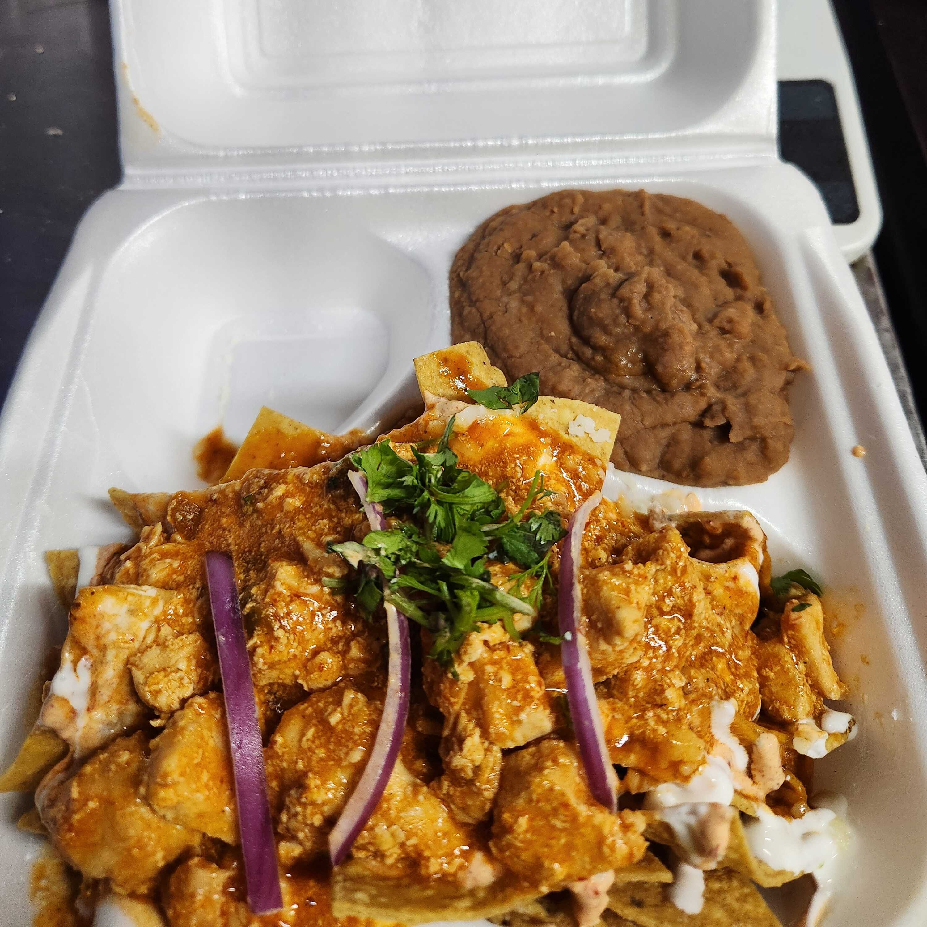 Chilaquiles con salsa a elegir, cremas, cebolla morada, cilantro y frijoles refritos acompañado de 1 salsa y complementos