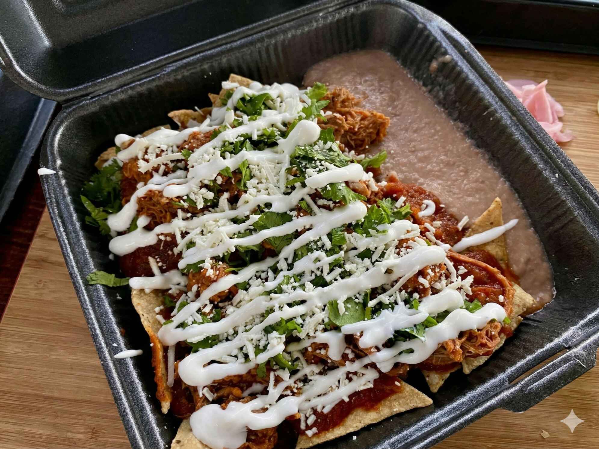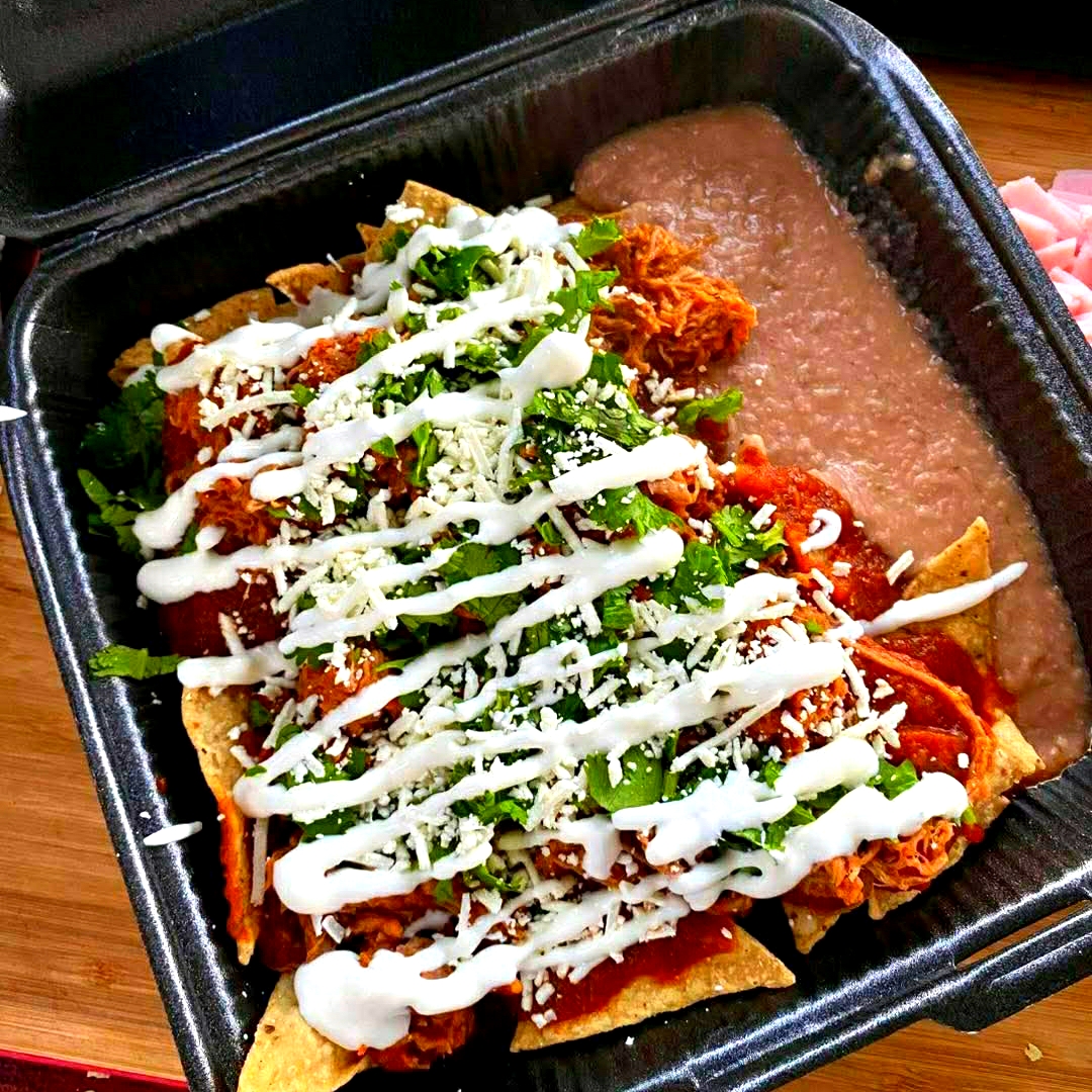 Chilaqyiles sencillos, consta de totopos, salsa roja, frijol, cebolla, cilantro, queso y crema.