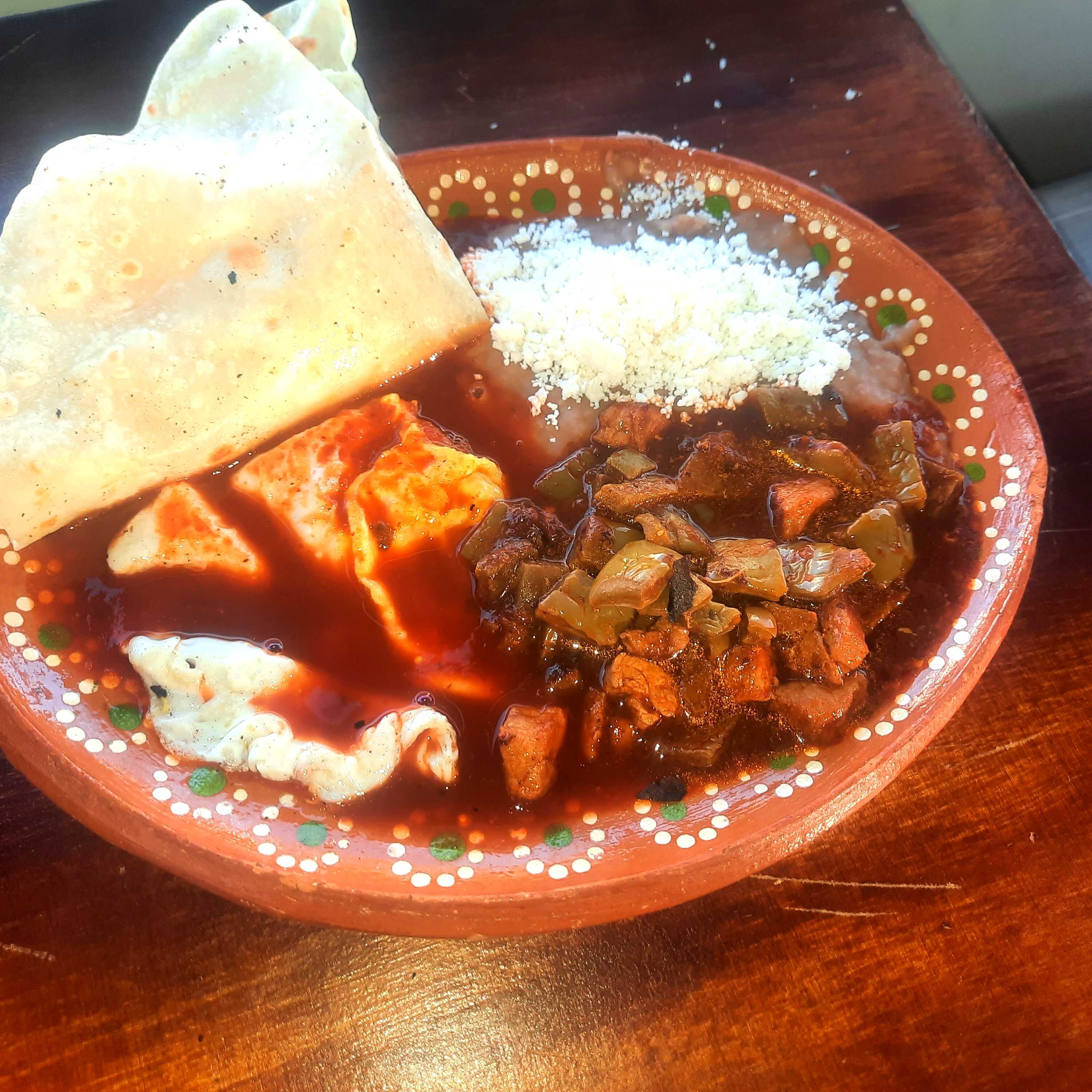 Desayuno consta de huevo al gusto, frijol, guisado a elegir, tortilla de harina o totopos.