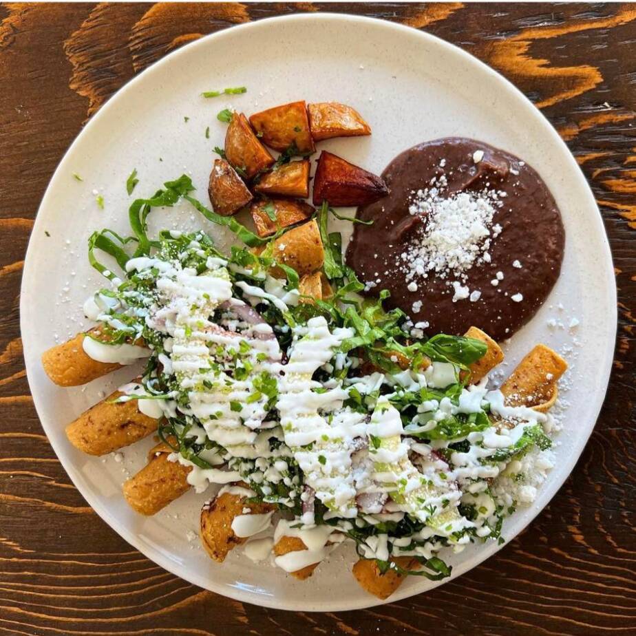 Flautas rellenas de pollo,. acompañadas de frijol negro y papas fritas, verdura encima y salsa de la casa a parte.