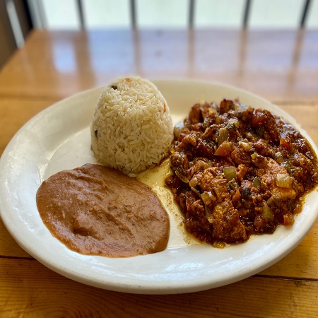 Chicharrón guisado en salsa, acompañado de frijoles y arroz.