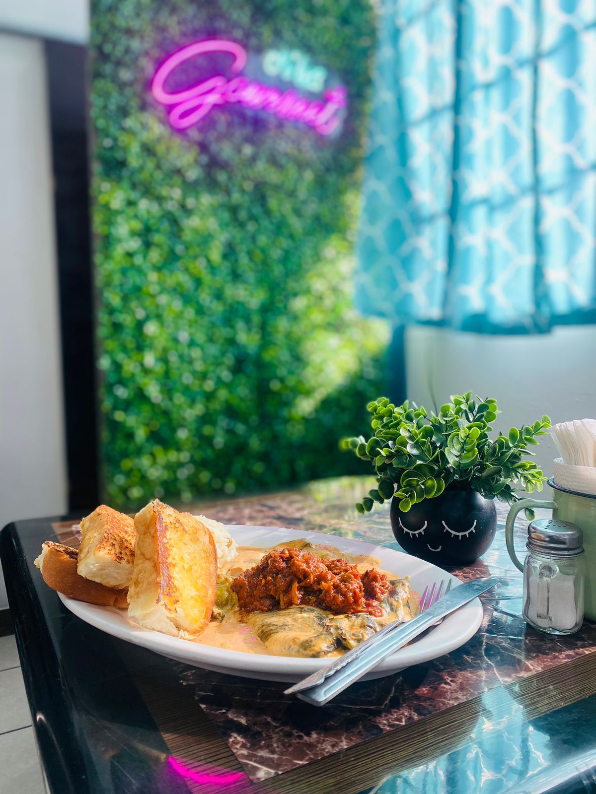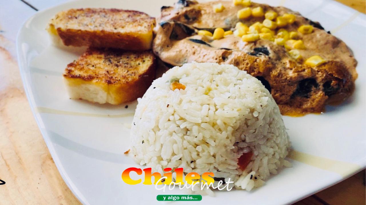 Orden de 2 chiles poblanos rellenos de queso crema, elote y queso monterrey, bañados en crema con chipotle, acompañados de arroz y pan con mantequilla.