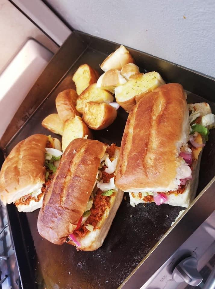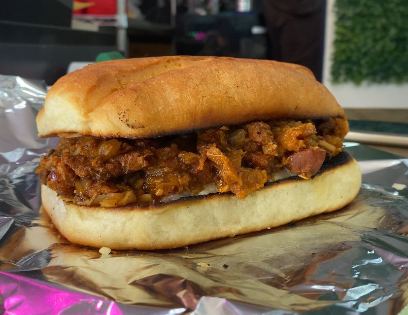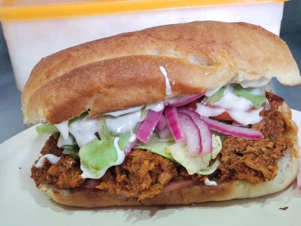 Carne de puerco adobada acompañada de lechuga, tomate, aguacate, cebolla morada curtida, mayonesa y queso amarillo.