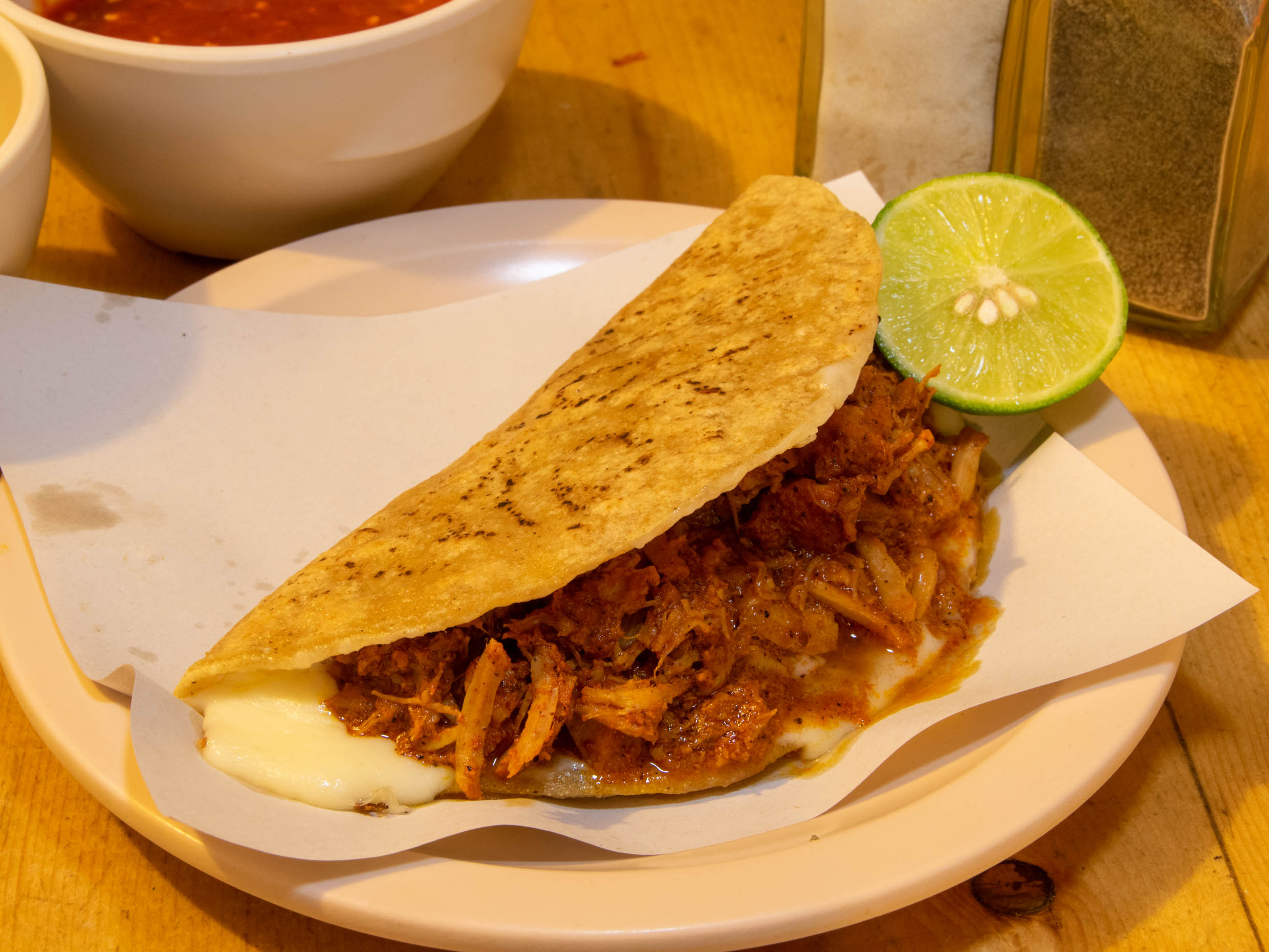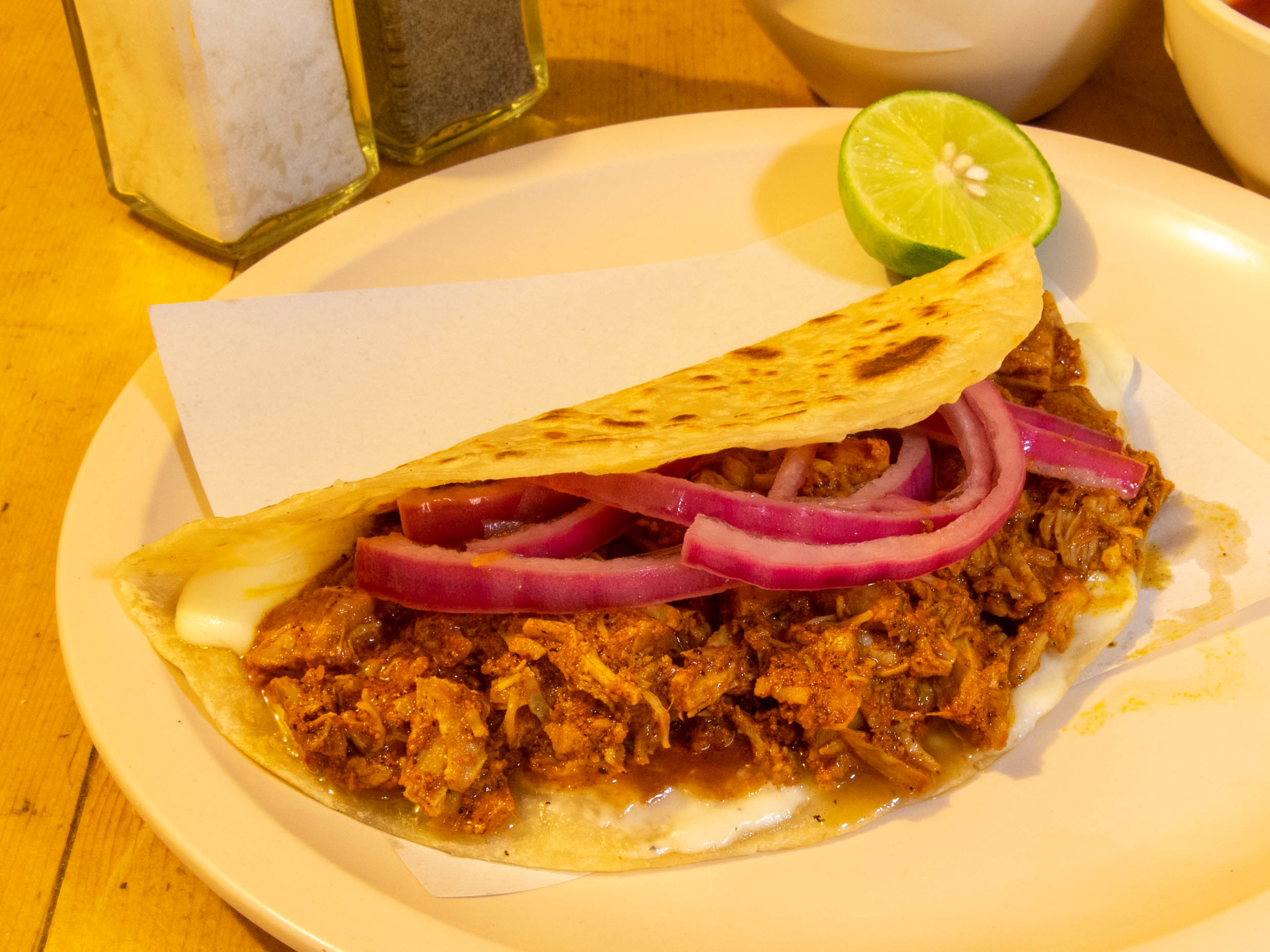 Quesadilla de harina rellena de cochinita, Incluye salsa, limón y cebolla morada.
