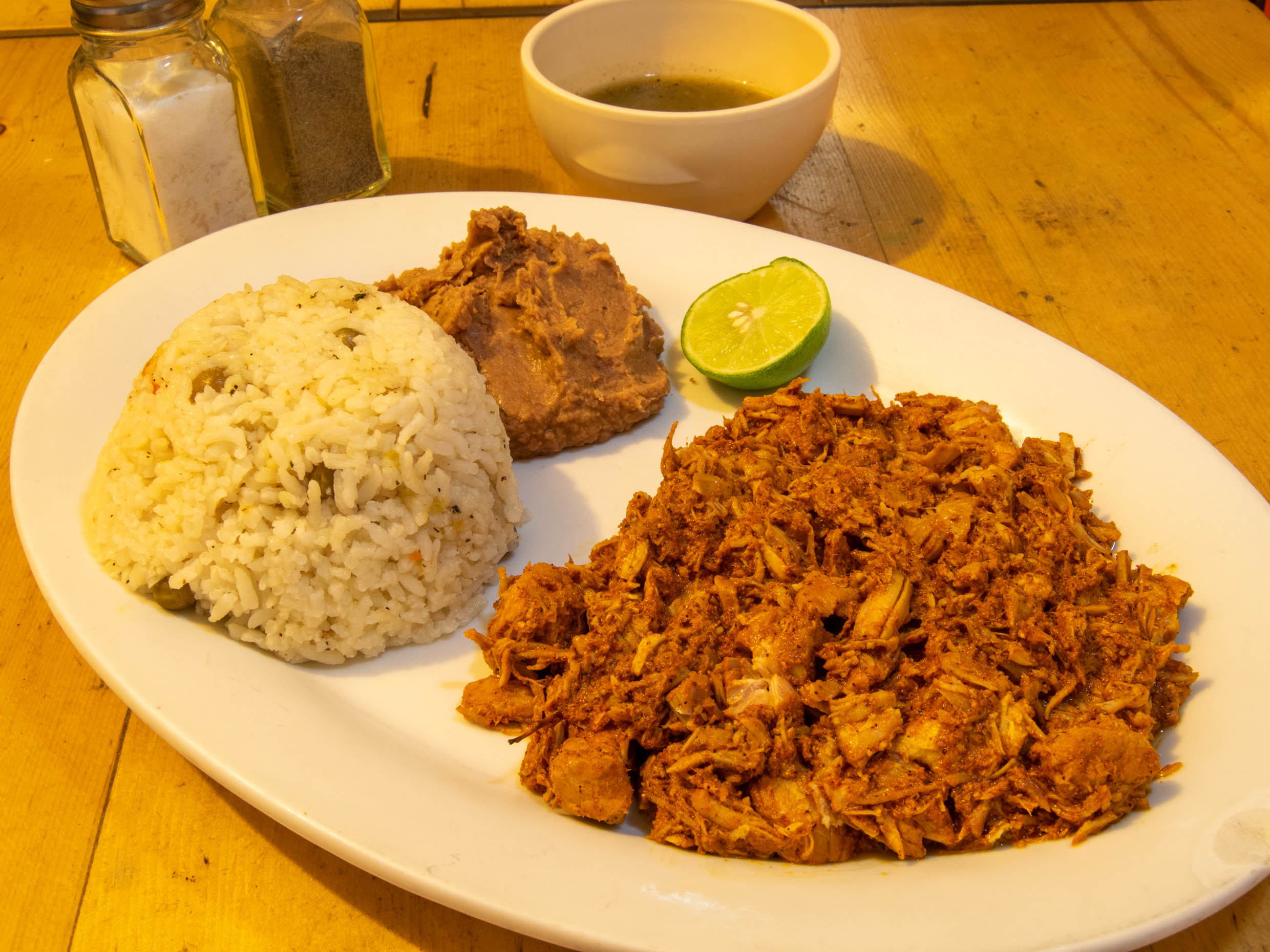 Barbacoa de res, acompañado de arroz y frijoles puercos.