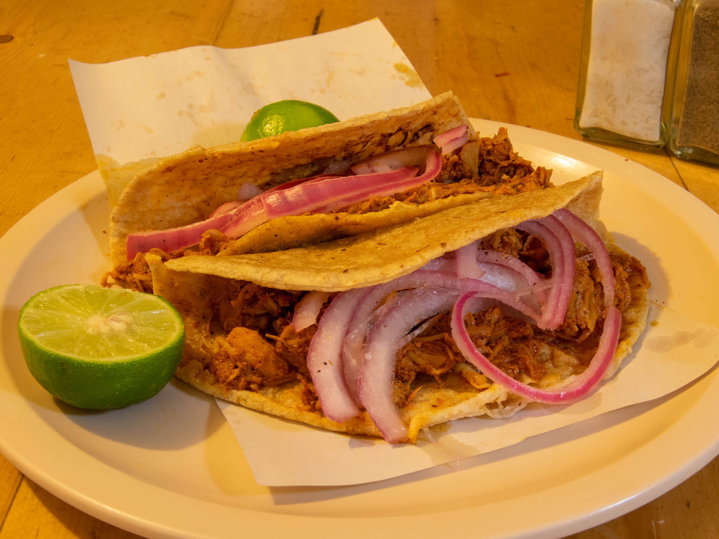 Tortilla de maíz con Cochinita Pibil, Incluye salsa, limón y cebolla morada.