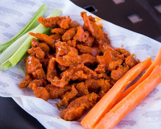 300 gramos de deliciosa pechuga de pollo empanizada y en tiritas, bañadas en la salsa de tu elección, acompañadas con aderezo especial de la casa, zanahoria y apio.