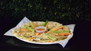 En nuestra tradicional tortilla de harina y una deliciosa mezcla de quesos con cebolla y chile california asado, acompañado de zanahoria, apio y salsa.