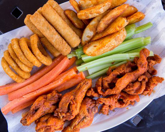 340 g De alitas y 150 gramos de boneless con salsa de tu elección, acompañadas de media orden de aros de cebolla, dedos de queso, papas sazonadas, zanahoria y apio.