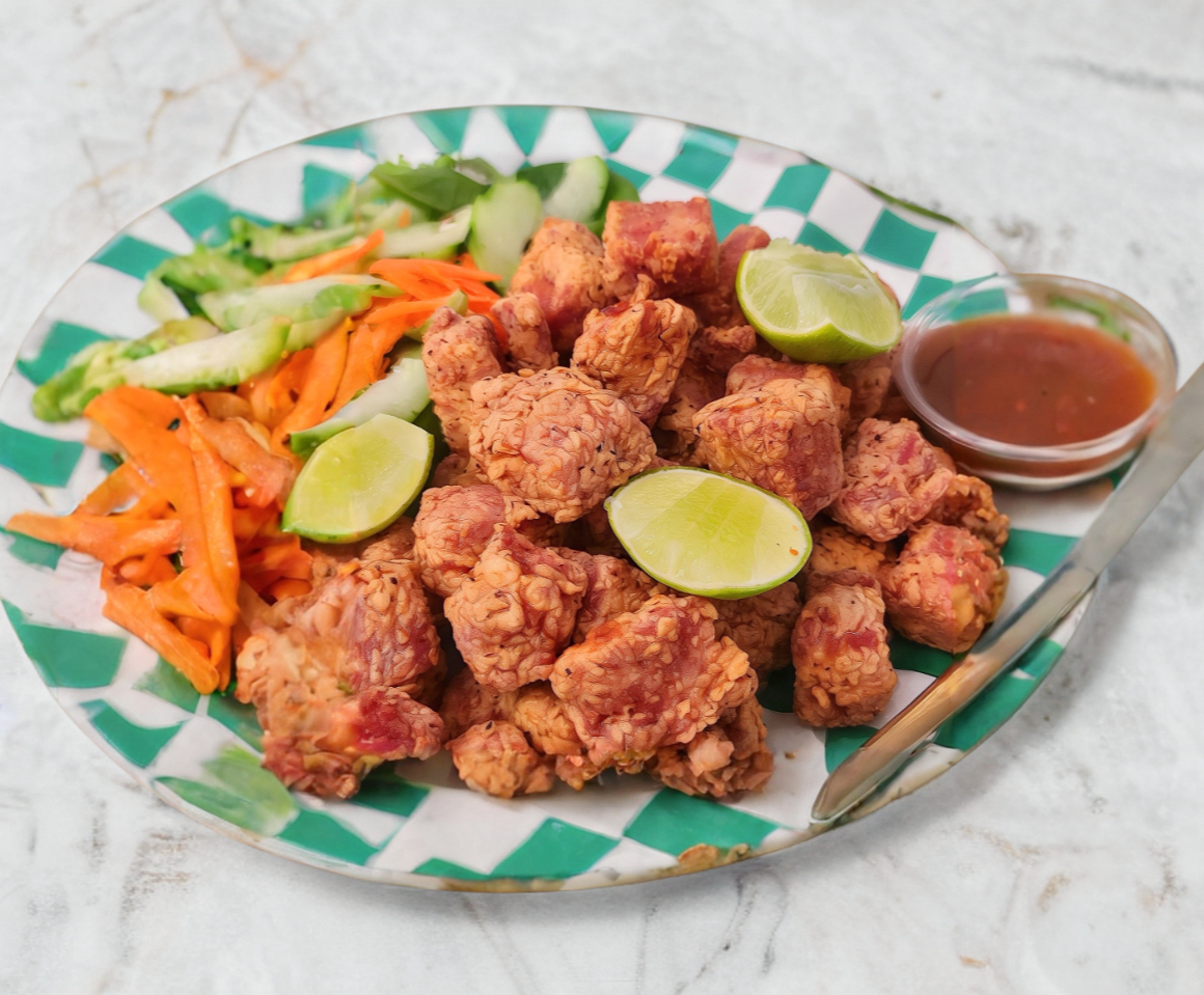 Chicharrones de atun acompañados de ensalada y salsa roja de la casa