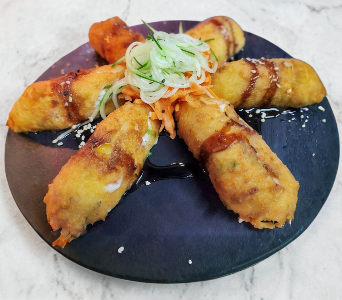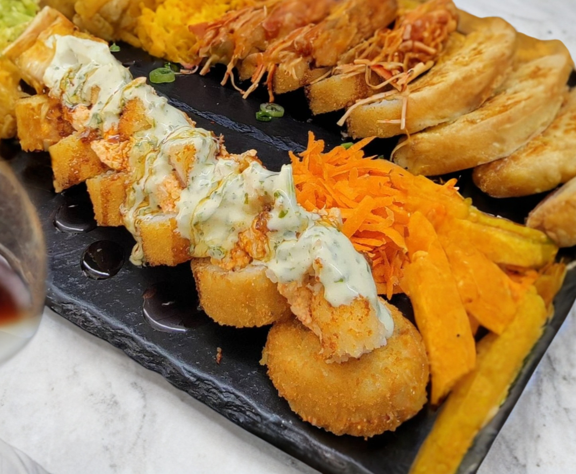 Camarón, Phila, pepino, aguacate, coronado con tampico, camarones capeados, bañados en aderezo roca, cabollín y ajonjolí.