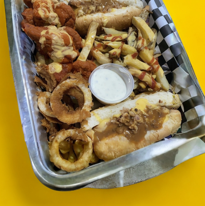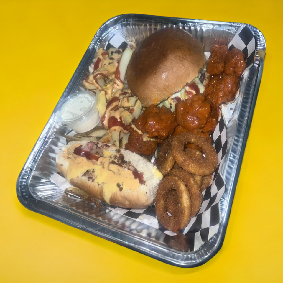1 HOTDOG+1HAMBURGUESA+PAPAS+250GRS ALITAS O BONELESS+AROS DE CEBOLLA +ADEREZO RANCHESS