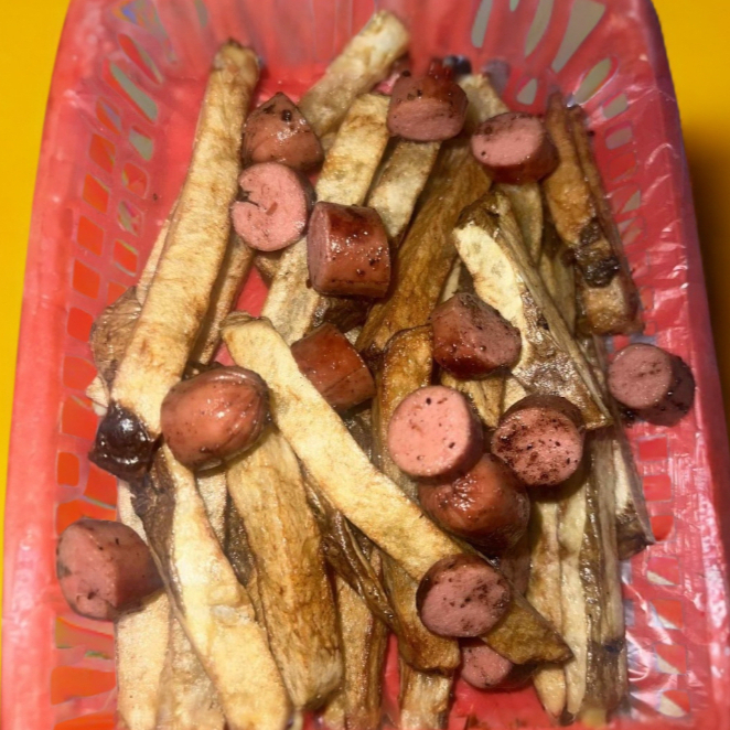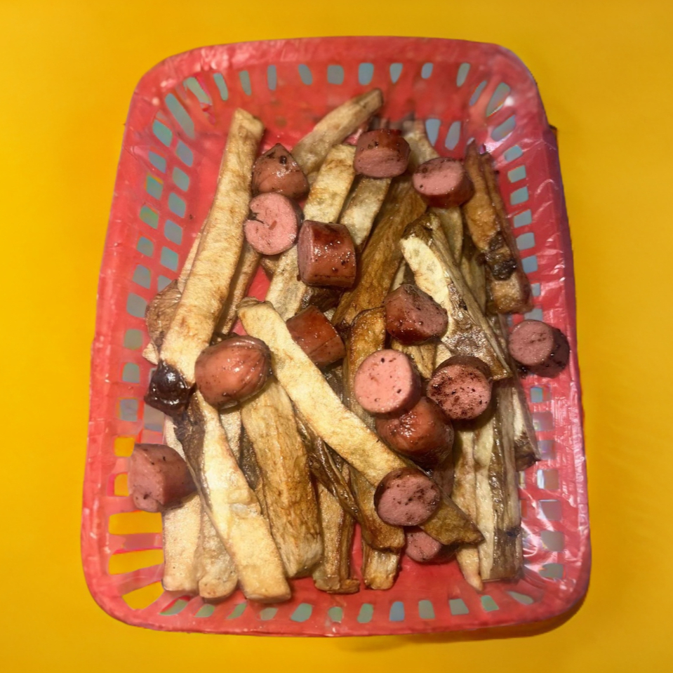 Papas a la francesa con trocitos de salchicha