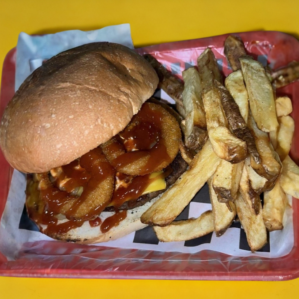 HAMBURGUESA BBQ + AROS DE CEBOLLA + PAPAS