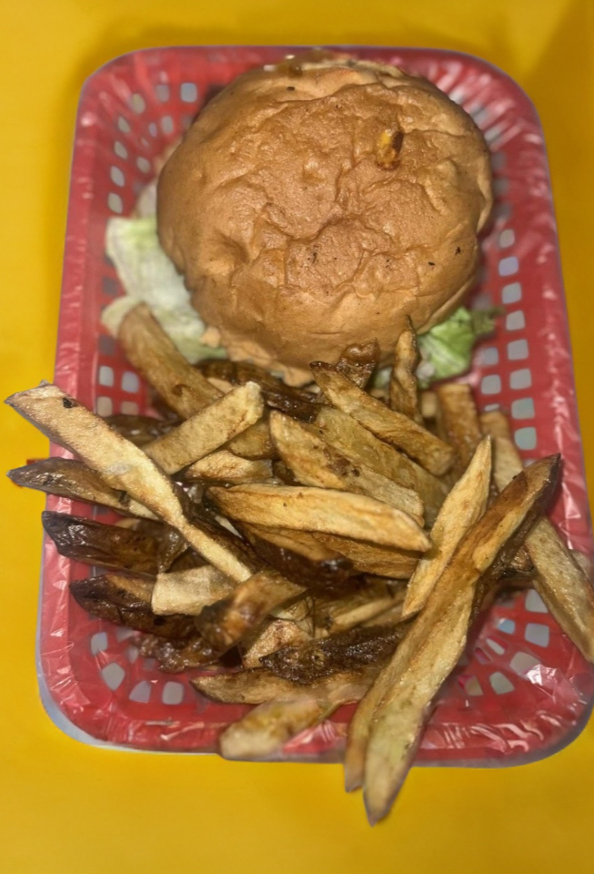 HAMBURGUESA BBQ + AROZ DE CEBOLLA + PAPAS