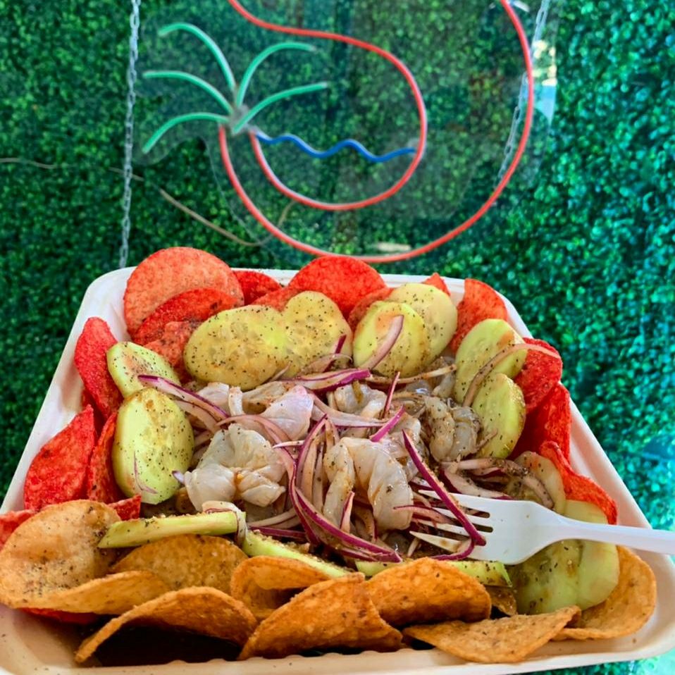Una combinación de camarón cocido y camarón curtido, carne seca, tostitos verdes y Fleming hot, pepino, cebolla morada, bañado en salsas y especias.