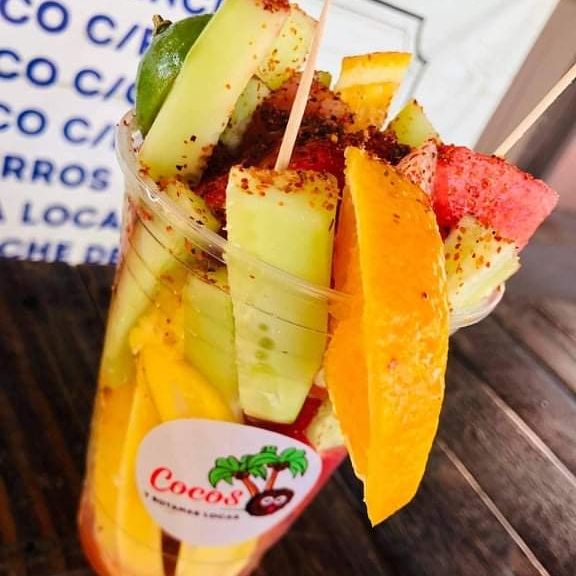 Coco en vaso 1 litro con fruta de temporada sujeta a disponibilidad. Mango, piña, pepino, jicama, naranja, chile, limón, Tajín y chamoy. Incluye su agua.