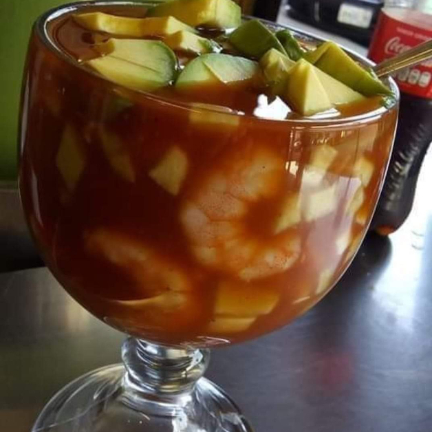 camaron, pepino, cebolla, limon, aguacate, salsa y catsup