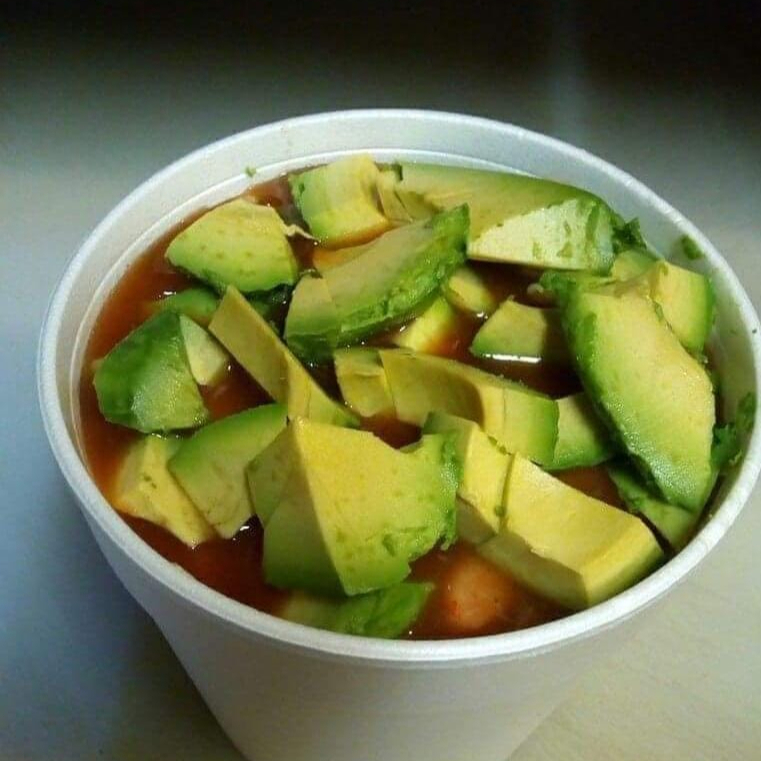 camaron, pulpo, callo de almeja catarina, pepino, cebolla, limon, aguacate, salsa y catsup