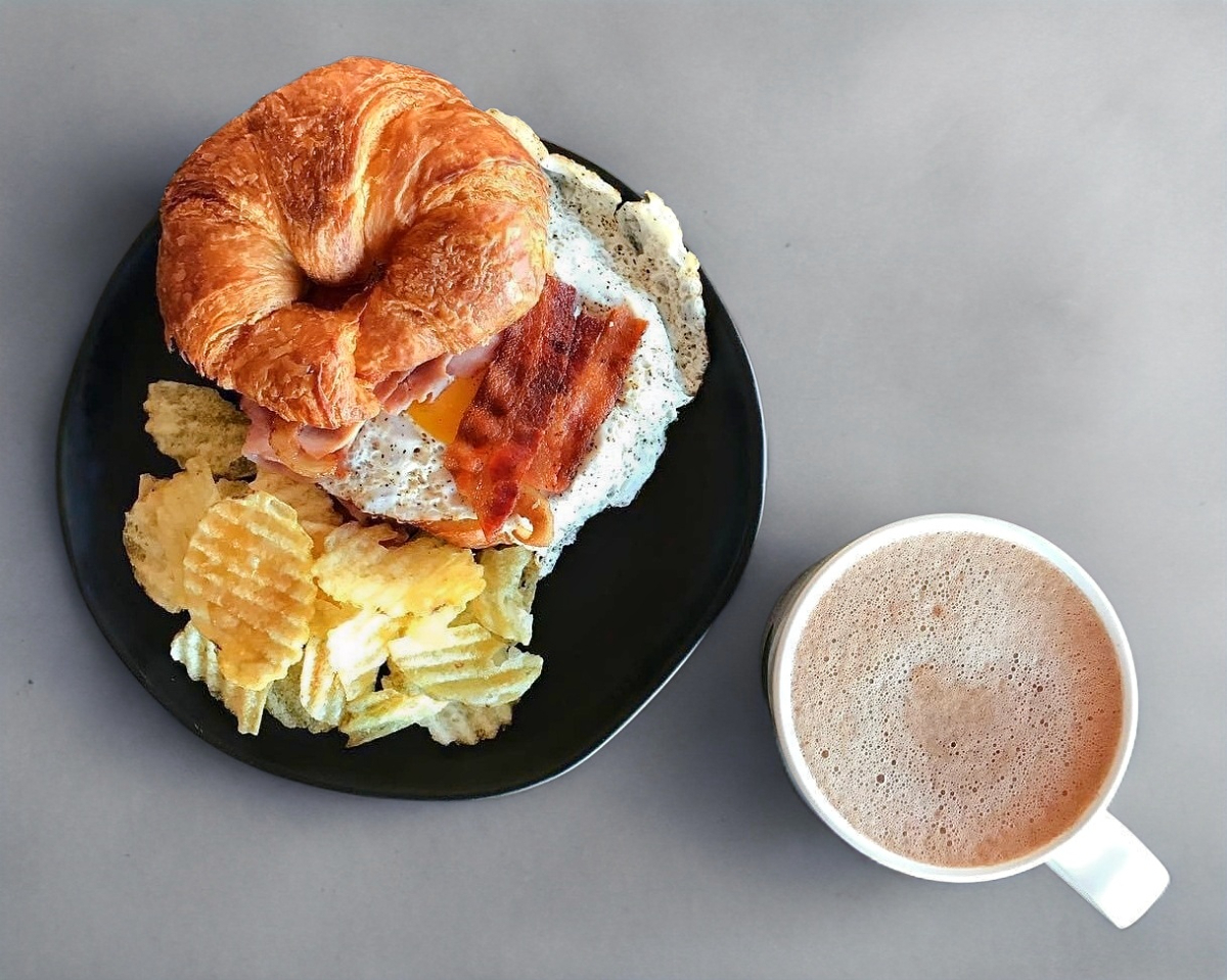 Cuernito con jamón de pavo y queso suizo más bebida latte en las rocas.