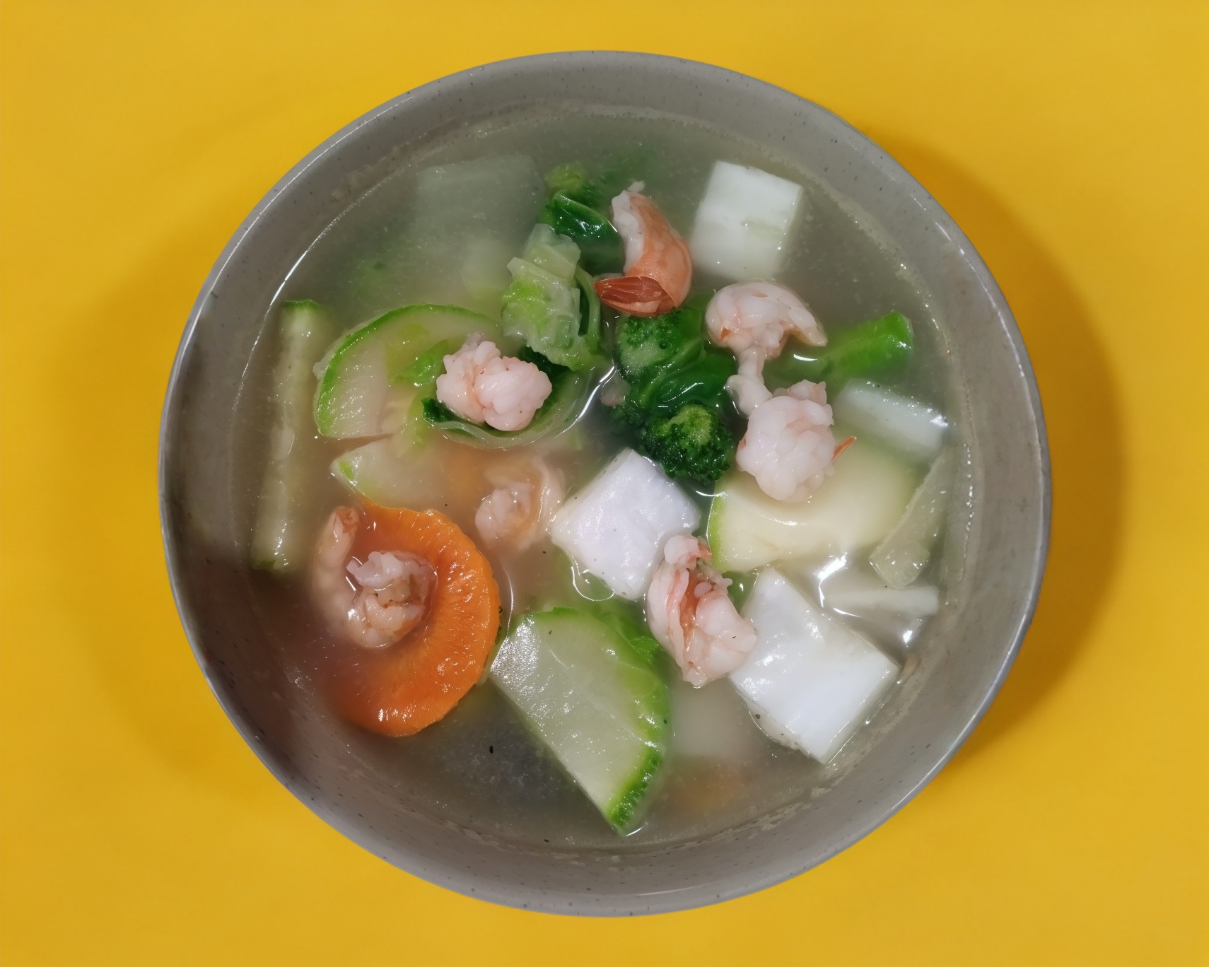 Sopa de verduras (quelite napa, brócoli, zanahoria, calabaza, etc.) con camarones.