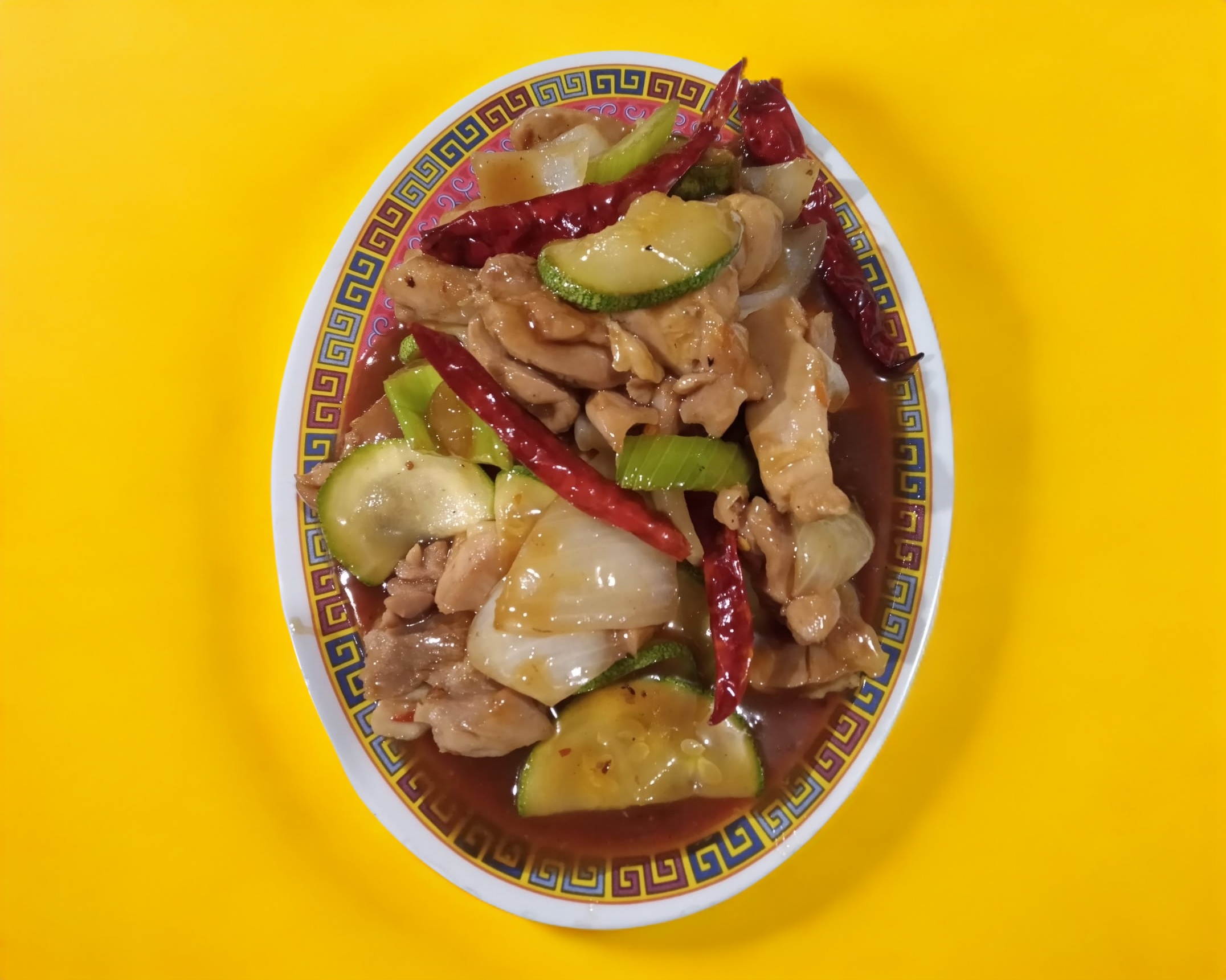 Pedacitos de pollo guisado con verduras (apio, cebolla, zanahoria, calabacita) y chile de árbol seco.