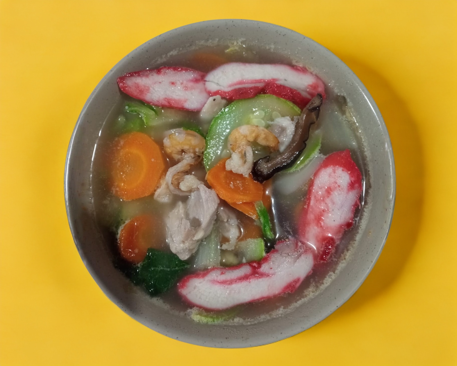 Sopa de verduras (quelite napa, brocoli, zanahoria, calabaza, etc) con pollo, camarones y carnitas rojas.