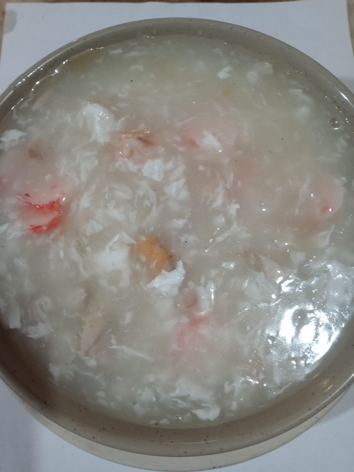 Sopa de aleta de tiburón (imitación), contiene clara de huevo, pollo, camarones y surimi.