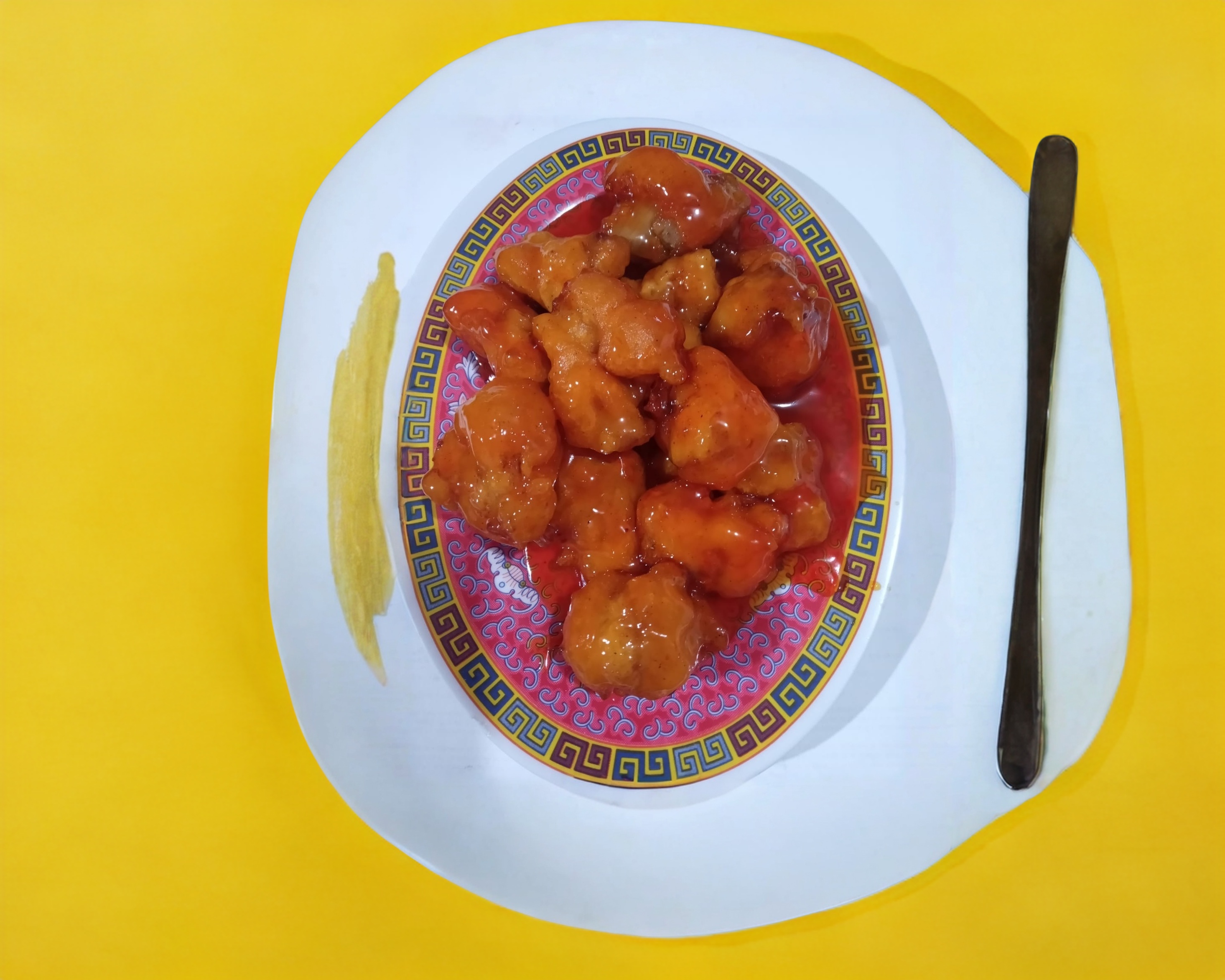 Pedacitos de pollo empanizado con salsa agridulce.