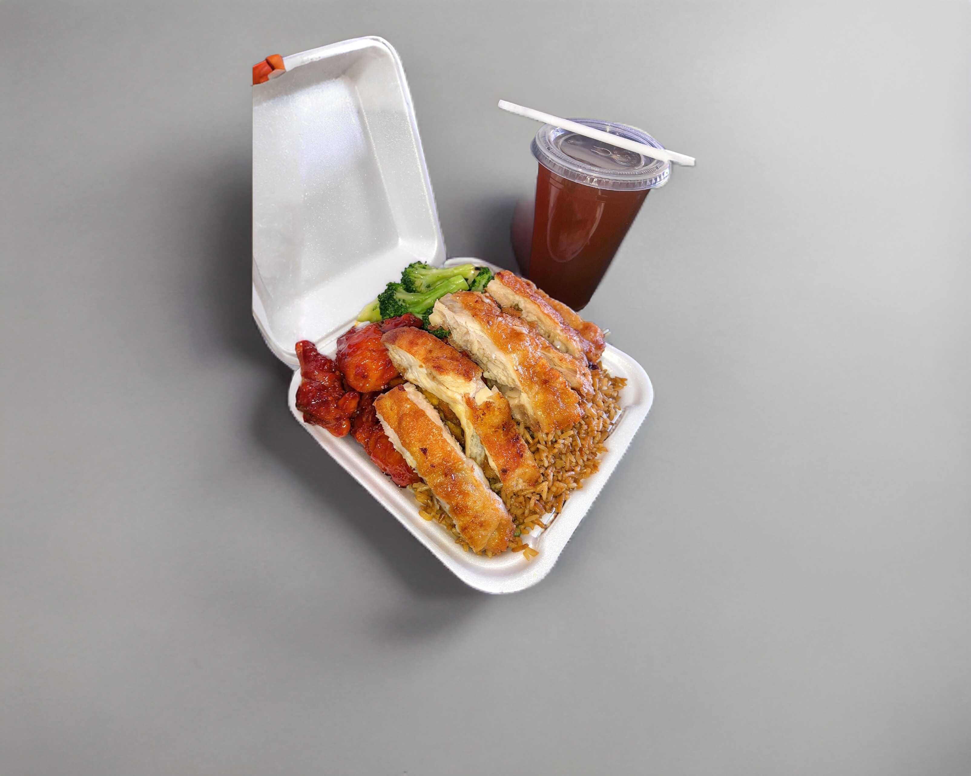 Una porción a elegir entre pollo a la plancha, carnitas coloradas, pollo mongol, pollo picante, pollo salpimienta, pollo con piña o carne de res mongol.