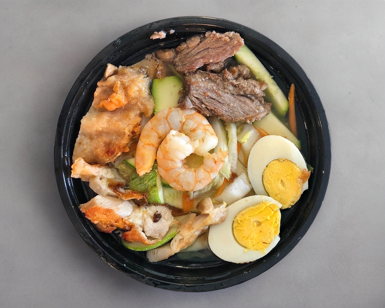 Caldo de sopa ramen con pollo, res, camarón, huevo cocido, napa, zanahoria, chop suey y calabaza.