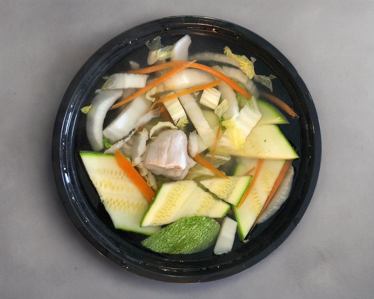Caldo de sopa ramen con pollo, huevo cocido, napa, zanahoria, chop suey y calabaza.