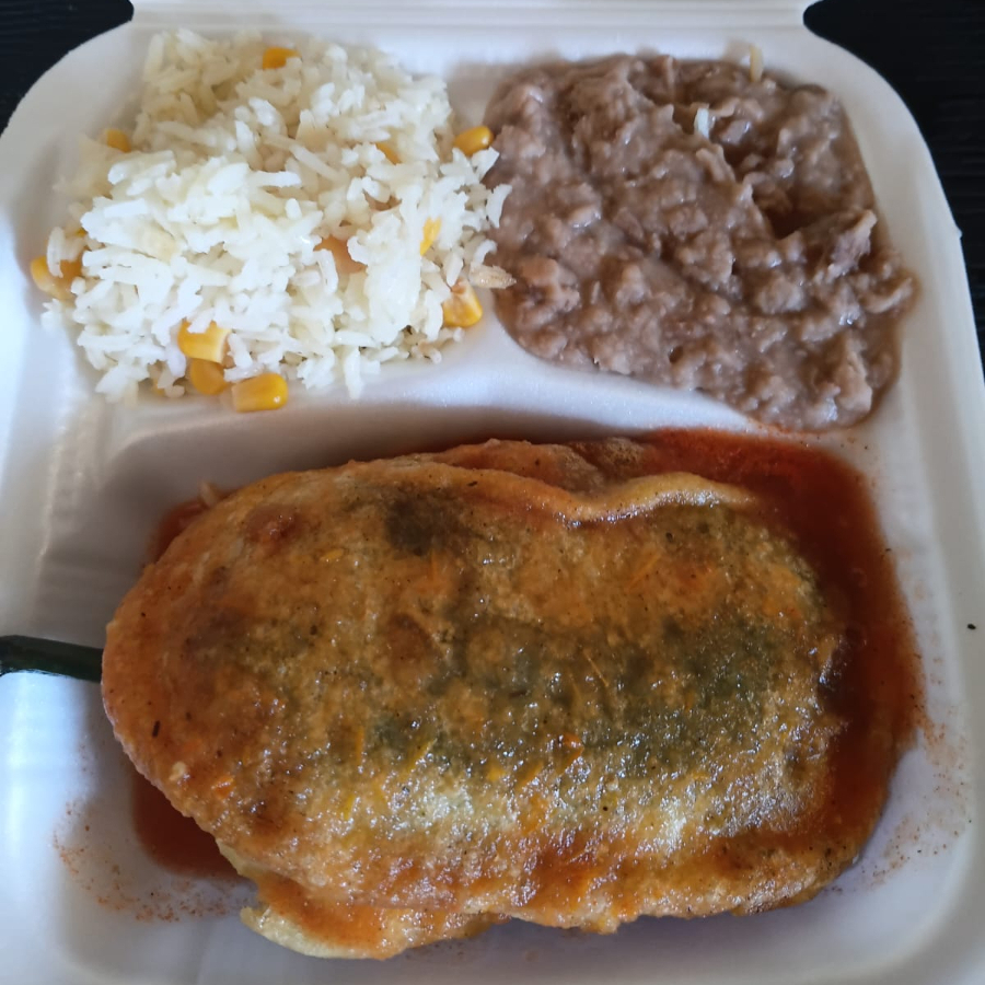 Pieza grande de chile poblano relleno de queso Monterrey, capeado y bañado en salsa de tomate. Incluye arroz, frijol y tortillas.